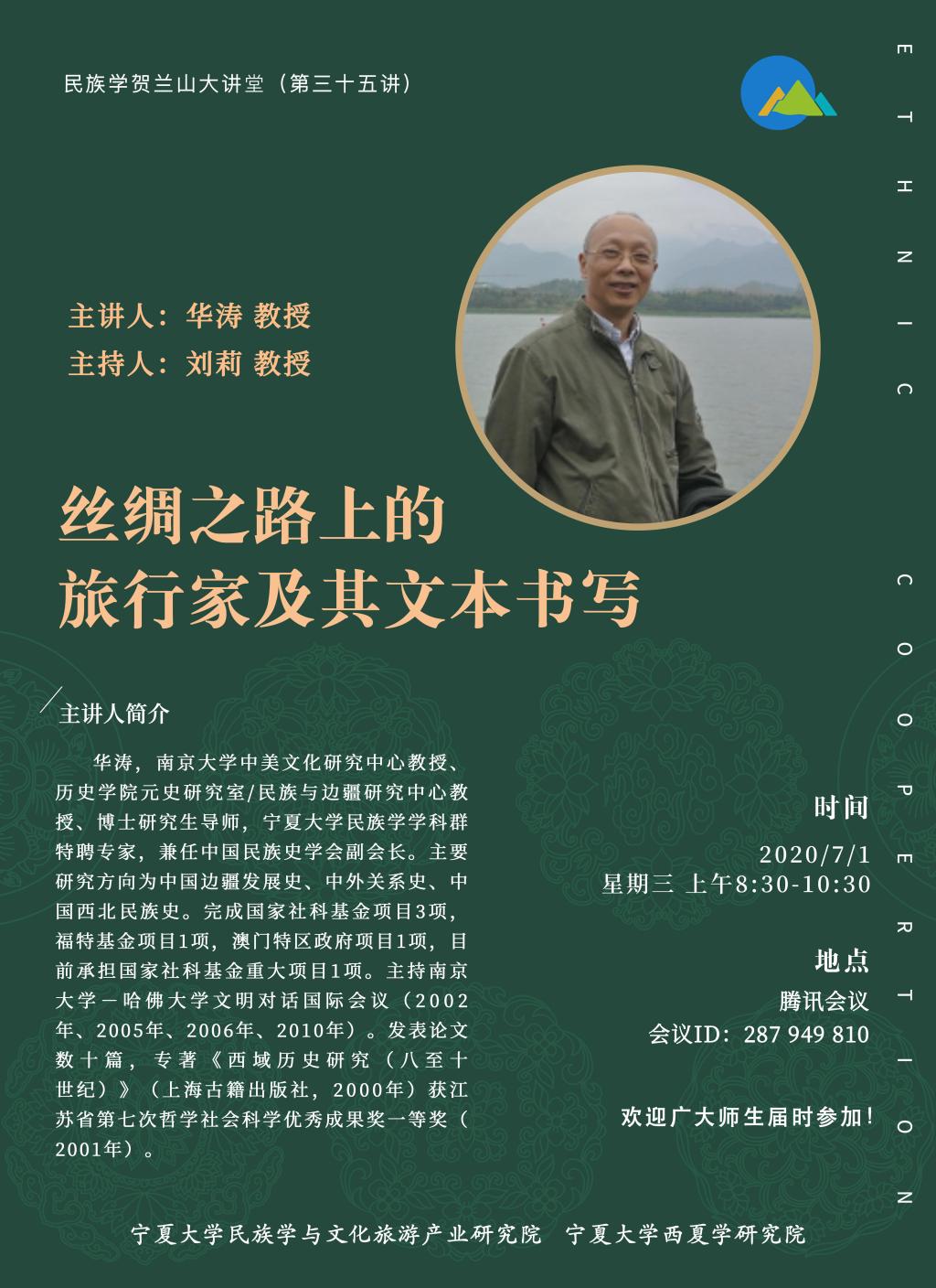 华涛,南京大学中美文化研究中心教授、历史学院元史研究室/民族与边疆研究中心教授、博士研究生导师,永利集团304官网民族学学科群特聘专家,兼任中国民族史学会副会长。主要研究方向为中国边疆发展史、中外关系史、中国西北民族史。完成国家社科基金项目3项,福特基金项目1项,澳门特区政府项目1项,目前承担国家社科基金重大项目1项。主持南京大学-哈佛大学文明对话国际会议(2002年、2005年、2006年、2010年)。发表论文数十篇,专著《西域历史研究(八至十世纪)》(上海古籍出版社,2000年)获江苏省第七次哲学社会科学优秀成果奖一等奖(2001年)。