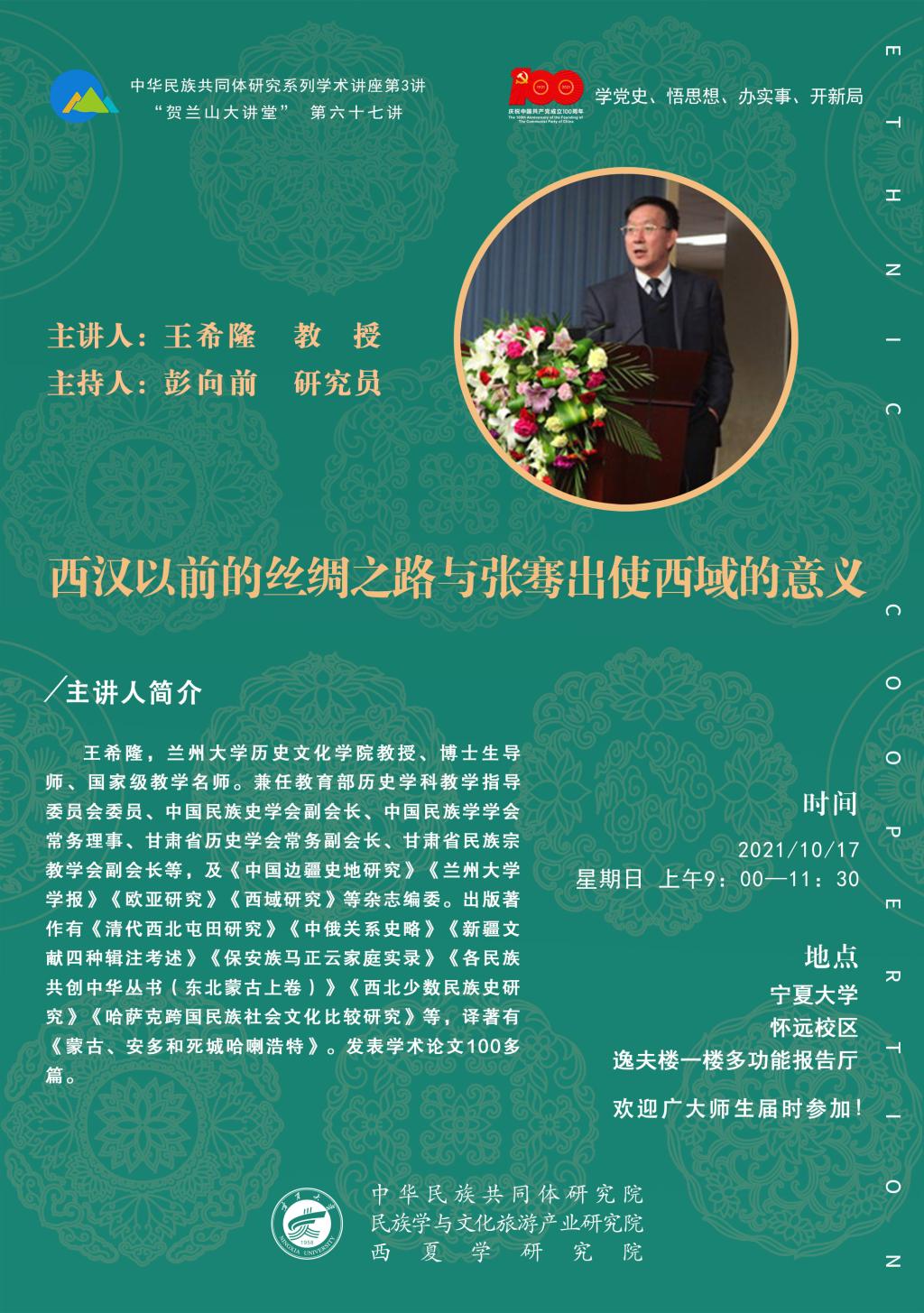 王希隆,兰州大学历史文化学院教授、博士生导师、国家级教学名师。兼任教育部历史学科教学指导委员会委员、中国民族史学会副会长、中国民族学学会常务理事、甘肃省历史学会常务副会长、甘肃省民族宗教学会副会长等,及《中国边疆史地研究》《兰州大学学报》《欧亚研究》《西域研究》等杂志编委。出版著作有《清代西北屯田研究》《中俄关系史略》《新疆文献四种辑注考述》《保安族马正云家庭实录》《各民族共创中华丛书(东北蒙古上卷)》《西北少数民族史研究》《哈萨克跨国民族社会文化比较研究》等,译著有《蒙古、安多和死城哈喇浩特》。发表学术论文100多篇。