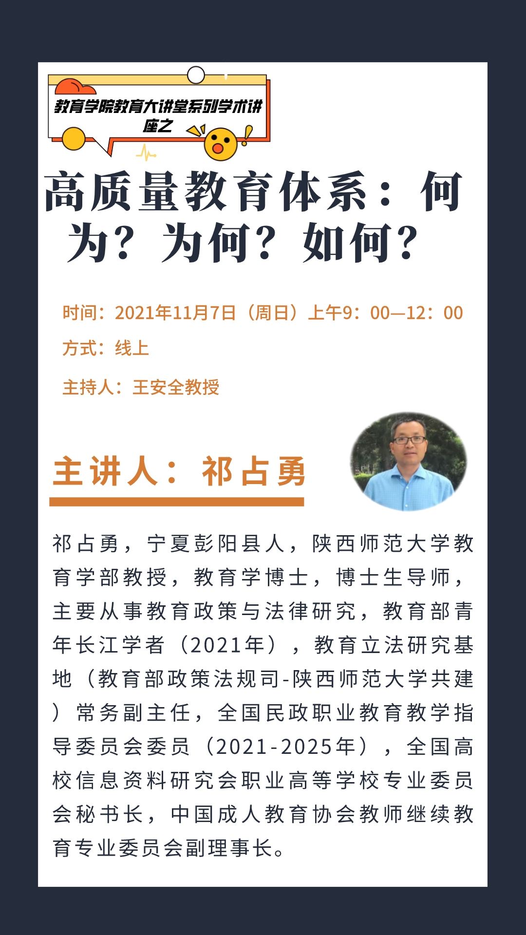 祁占勇,宁夏彭阳县人,陕西师范大学教育学部教授,教育学博士,博士生导师,主要从事教育政策与法律研究,教育部青年长江学者(2021年),教育立法研究基地(教育部政策法规司-陕西师范大学共建)常务副主任,全国民政职业教育教学指.导委员会委员(2021-2025年),全国高校信息资料研究会职业高等学校专业委员会秘书长,中国成人教育协会教师继续教育专业委员会副理事长。