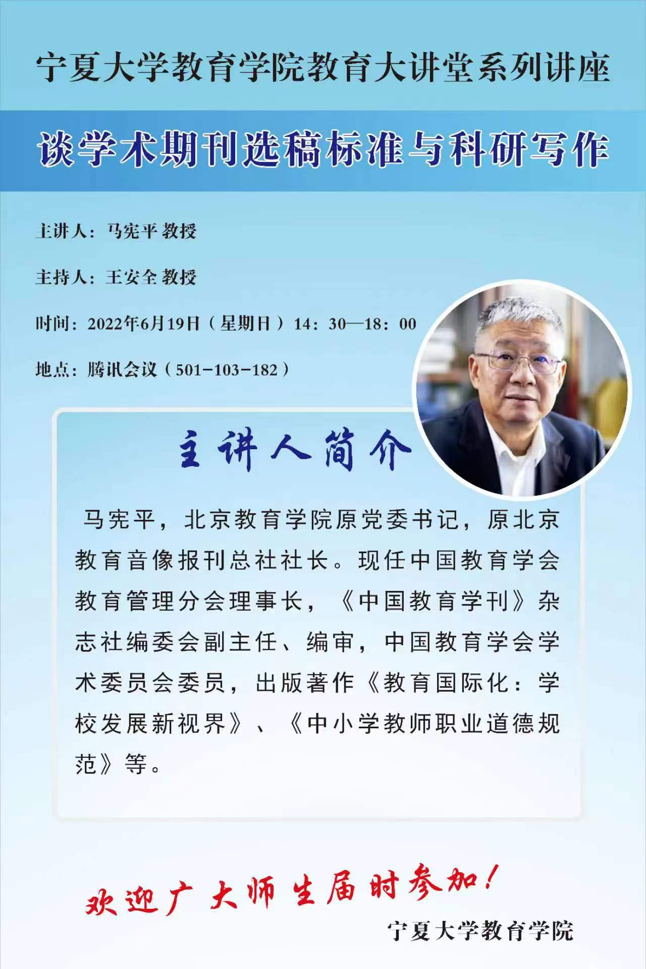 马宪平,北京教育学院原党委书记,原北京教育音像报刊总社社长。现任中国教育学会教育管理分会理事长,《中国教育学刊》杂志社编委会副主任、编审,中国教育学会学术委员会委员,出版著作《教育国际化:学校发展新视界》、《中小学教师职业道德规范》等。