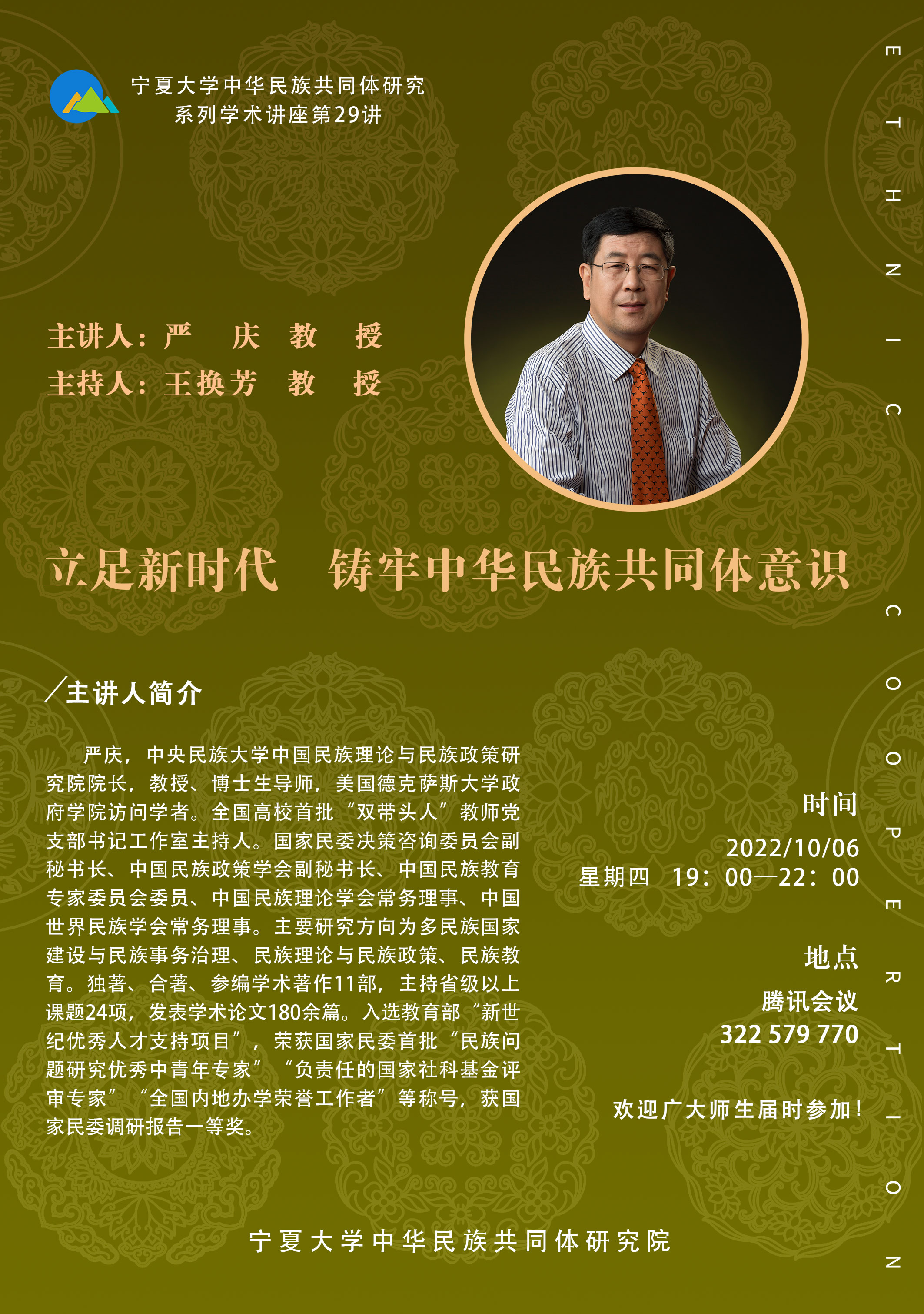 严庆,中央民族大学中国民族理论与民族政策研究院院长,教授、博士生导师,美国德克萨斯大学政府学院访问学者。全国高校首批“双带头人”教师党支部书记工作室主持人。国家民委决策咨询委员会副秘书长、中国民族政策学会副秘书长、中国民族教育专家委员会委员、中国民族理论学会常务理事、中国世界民族学会常务理事。主要研究方向为多民族国家建设与民族事务治理、民族理论与民族政策、民族教育。独著、合著、参编学术著作11部,主持省级以上课题24项,发表学术论文180余篇。入选教育部“新世纪优秀人才支持项目”,荣获国家民委首批“民族问题研究优秀中青年专家”“负责任的国家社科基金评审专家”“全国内地办学荣誉工作者”等称号,获国家民委调研报告一等奖。