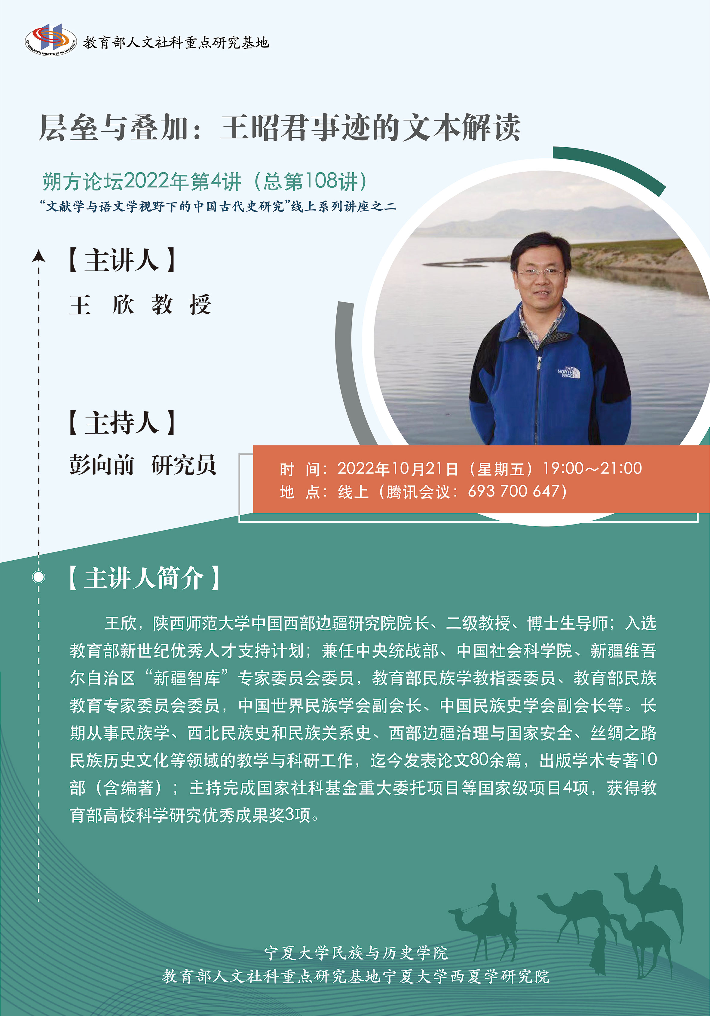 王欣,陕西师范大学中国西部边疆研究院院长、二级教授、博士生导师;入选教育部新世纪优秀人才支持计划;兼任中央统战部、中国社会科学院、新疆维吾尔自治区“新疆智库”专家委员会委员,教育部民族学教指委委员、教育部民族教育专家委员会委员,中国世界民族学会副会长、中国民族史学会副会长等。长期从事民族学、西北民族史和民族关系史、西部边疆治理与国家安全、丝绸之路民族历史文化等领域的教学与科研工作,迄今发表论文80余篇,出版学术专著10部(含编著);主持完成国家社科基金重大委托项目等国家级项目4项,获得教育部高校科学研究优秀成果奖3项。