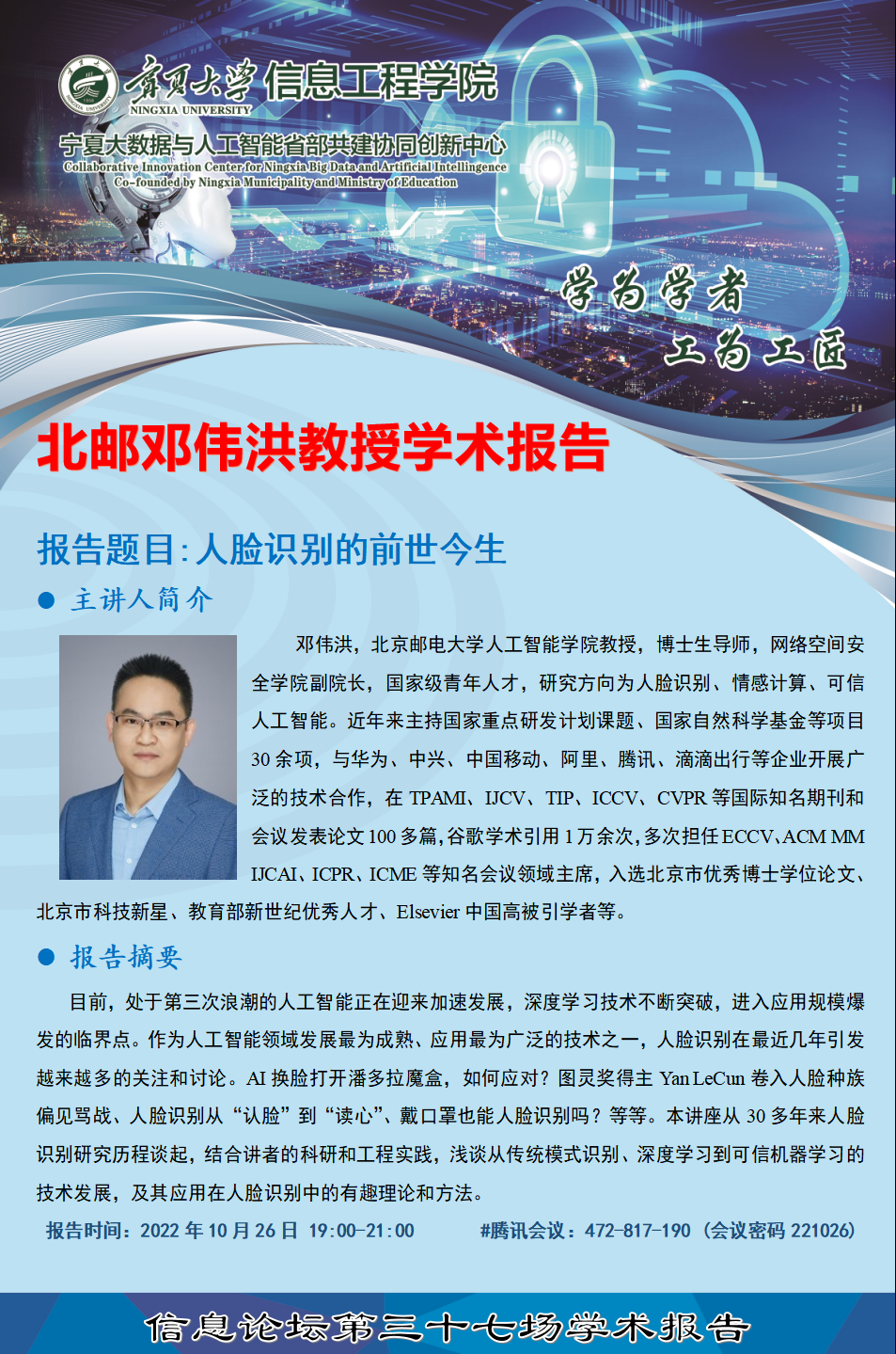邓伟洪,北京邮电大学人工智能学院教授,博士生导师,网络空间安全学院副院长,国家级青年人才,研究方向为人脸识别、情感计算、可信人工智能。近年来主持国家重点研发计划课题、国家自然科学基金等项目30余项,与华为、中兴、中国移动、阿里、腾讯、滴滴出行等企业开展广泛的技术合作,在TPAMI、IJCV、TIP、ICCV、CVPR等国际知名期刊和会议发表论文100多篇,谷歌学术引用1万余次,多次担任ECCV、ACM MM、IJCAI、ICPR、ICME等知名会议领域主席,入选北京市优秀博士学位论文、北京市科技新星、教育部新世纪优秀人才、Elsevier中国高被引学者等。