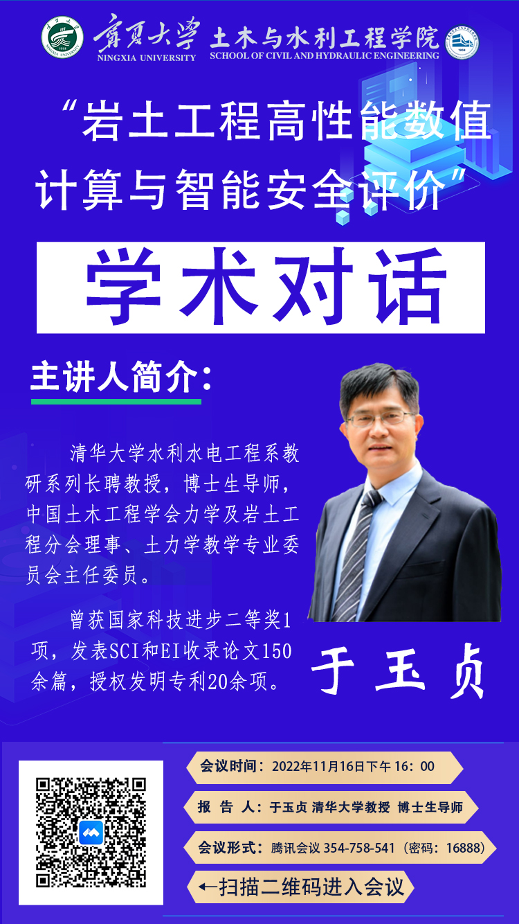 于玉贞,清华大学水利水电工程系教研系列长聘教授,博士生导师,中国土木工程学会土力学及岩土工程分会理事、土力学教学专业委员会主任委员。分别于1989年和1995年于清华大学获工学学士和工学博士学位。获国家科技进步二等奖,发表SCI和EI收录期刊论文150余篇、授权发明专利20余项,所讲授国家级精品课《土力学》获北京市教育教学成果二等奖。从事岩土工程安全评价与高性能数值计算研究30余年,在土石坝工程领域、边坡工程领域有着深厚的研究造诣,所研究成果已直接应用于国内十余座高土石坝工程。