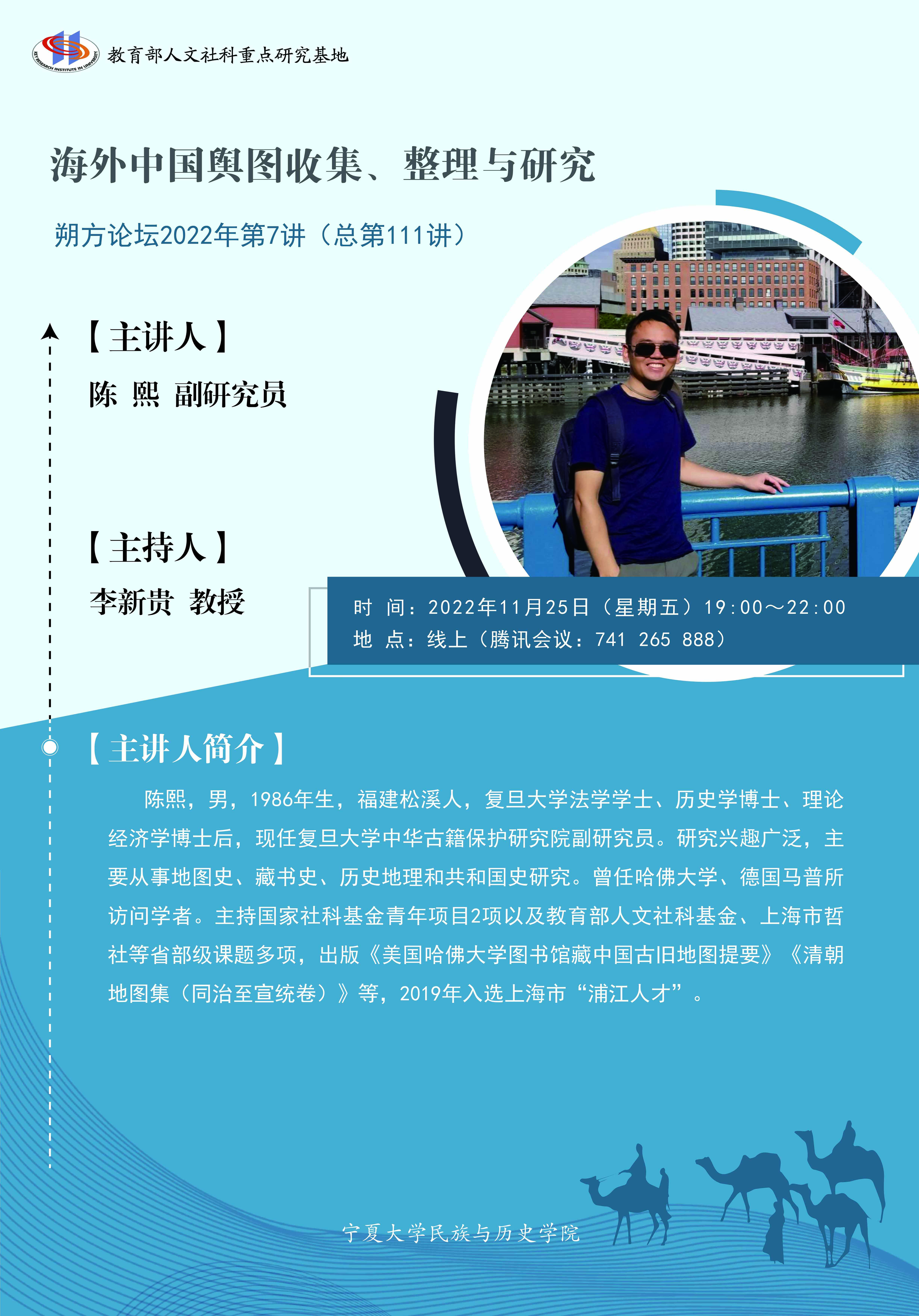 陈熙,男,1986年生,福建松溪人,复旦大学法学学士、历史学博士、理论经济学博士后,现任复旦大学中华古籍保护研究院副研究员。研究兴趣广泛,主要从事地图史、藏书史、历史地理和共和国史研究。曾任哈佛大学、德国马普所访问学者。主持国家社科基金青年项目2项以及教育部人文社科基金、上海市哲社等省部级课题多项,出版《美国哈佛大学图书馆藏中国古旧地图提要》《清朝地图集(同治至宣统卷)》等,2019年入选上海市“浦江人才”。