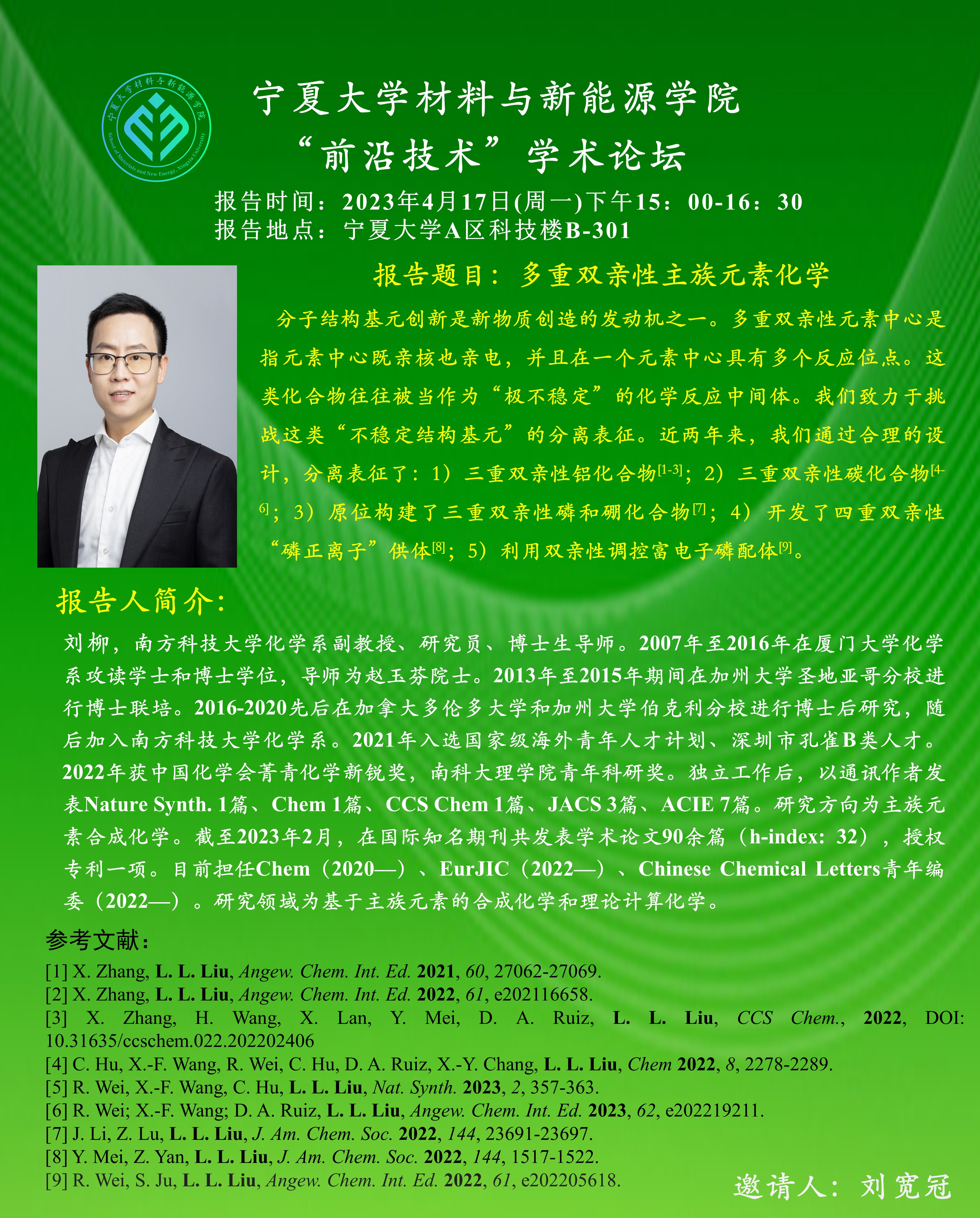 刘柳,南方科技大学化学系副教授、研究员、博士生导师。2007年至2016年在厦门大学化学系攻读学士和博士学位,导师为赵玉芬院士。2013年至2015年期间在加州大学圣地亚哥分校进行博士联培。2016-2020先后在加拿大多伦多大学和加州大学伯克利分校进行博士后研究,随后加入南方科技大学化学系。2021年入选国家级海外青年人才计划、深圳市孔雀B类人才。2022年获中国化学会菁青化学新锐奖,南科大理学院青年科研奖。独立工作后,以通讯作者发表Nature Synth.1篇、Chem1篇、CCS Chem1篇、JACS3篇、ACIE7篇。研究方向为主族元素合成化学。截至2023年2月,在国际知名期刊共发表学术论文90余篇(h-index: 32),授权专利一项。目前担任Chem(2020—)、EurJIC(2022—)、Chinese Chemical Letters青年编委(2022—)。研究领域为基于主族元素的合成化学和理论计算化学。