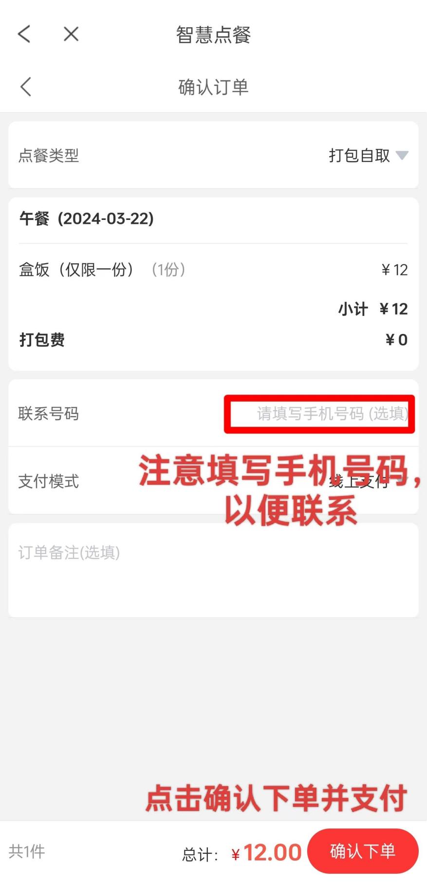 5.填写手机号码,点击确认下单并支付;