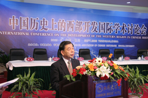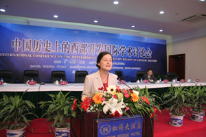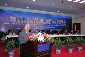开幕式结束后,进行了大会发言。陈育宁教授作了《反思历史 关注现实 努力推进新时期的西部大开发》的发言。他围绕“建国后的西部开发”、“五年来西部开发取得重要进展”、“西部大开发任重道远”等三个问题,运用翔实的历史资料,严密的逻辑推理、图文并茂地进行了阐述。保母武彦教授、席慕蓉女士、巴斯蒂夫人以及中国科学院地理科学与资源研究所黄盛璋研究员也作了精彩发言。大会发言由中国史学会副会长、北京师范大学副校长郑师渠教授主持。