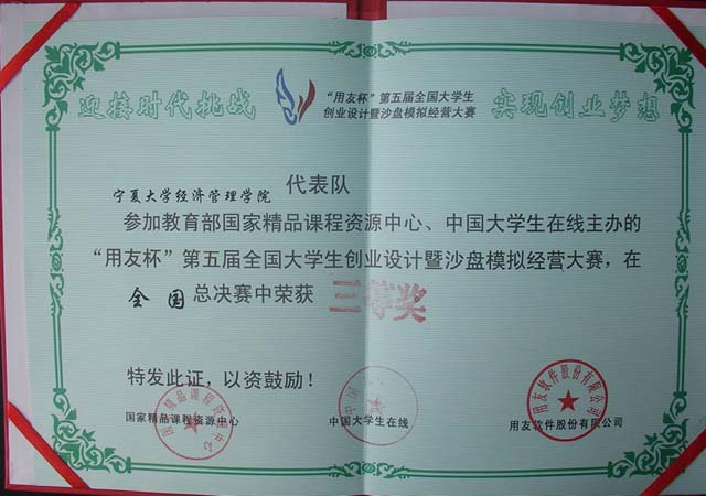 由教育部高等教育司支持、教育部高等学校工商管理类学科专业教学指导委员会指导、教育部国家精品课程资源中心与教育部中国大学生在线联合主办、用友公司承办的“用友杯”第五届全国大学生创业设计暨沙盘模拟经营大赛总决赛于2009年7月28-29日在北京举行。我院代表队以本科组三等奖的优异成绩,为永利集团304官网和经济管理学院争得了荣誉。