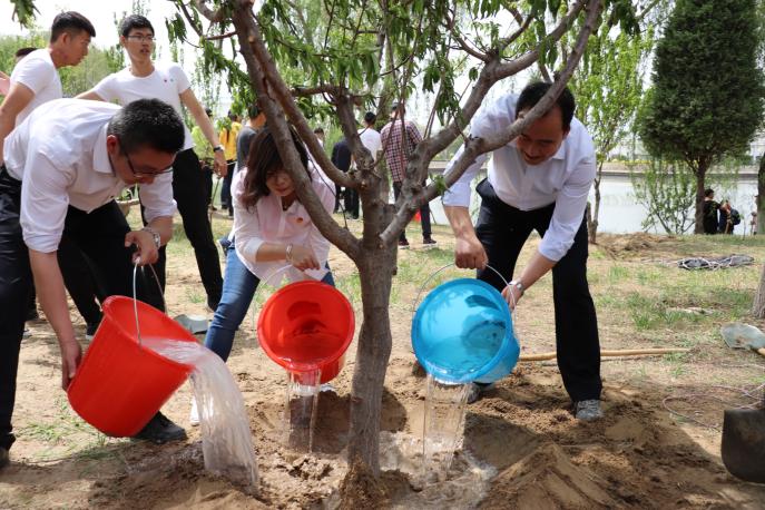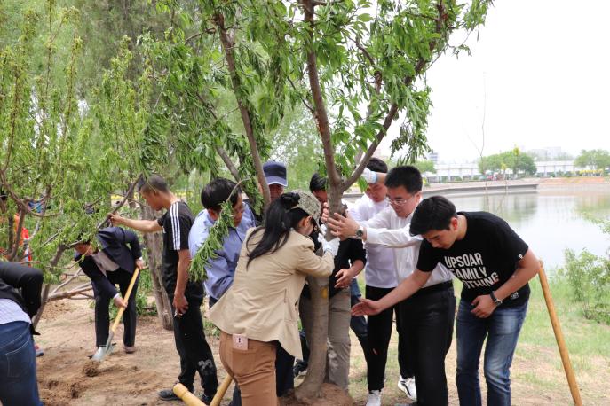 下午两点,金波湖桃李园人头攒动,热闹非凡。校领导和师生代表在专业技术人员的精心指导下,大家三四人一组,齐心协力,挖坑、铲土、运树、扶树、填土、浇水……,每个程序都有条不紊地进行着,现场一片热闹、繁忙的景象。经过一个小时的共同努力,总计120株桃树和李树在金波湖畔落地生根,为美丽的校园再添新绿。活动结束后,在郁郁葱葱的桃李园旁,校领导与师生代表合影留念,大家齐声高喊着:“永利六十年,再创新辉煌!”,欢声笑语在校园的上空久久回荡着,为即将到来的60周年校庆再添喜色。