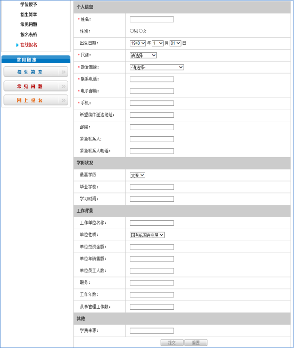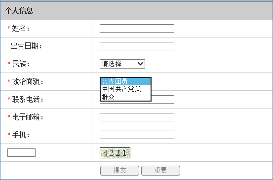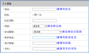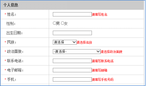 如图,这是一个高校的网站前台比较复杂报名表单的样式。接下来使这个表单为例子介绍,表单自定义其他高级功能的使用。