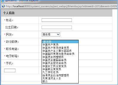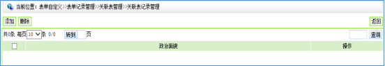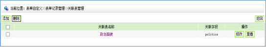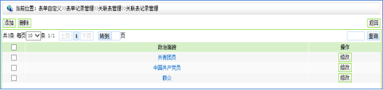 关联表名称,进入到添加关联表数据添加页面,如图3-5所示。添加数据后如图3-6所示。前台页面政治面貌下拉列表的数据就会被替换成后台添加的数据。如图3-7所示。