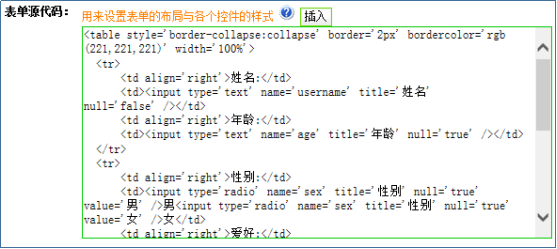 :填写需要添加的表单HTML页面,<body></body>标签里的代码,
