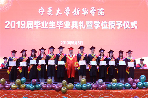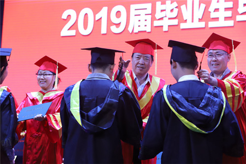 在学位授予环节中,新华学院2019届毕生们身着学位服依次走上主席台,学位评定委员会委员及出席领导为他们一一拨穂正冠、颁发证书并合影留念,为大学生涯画上了圆满的句号。