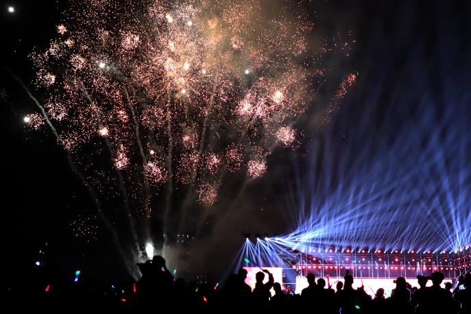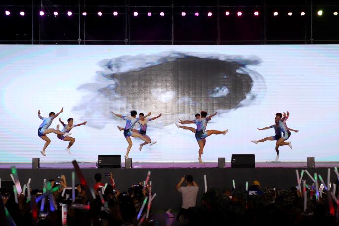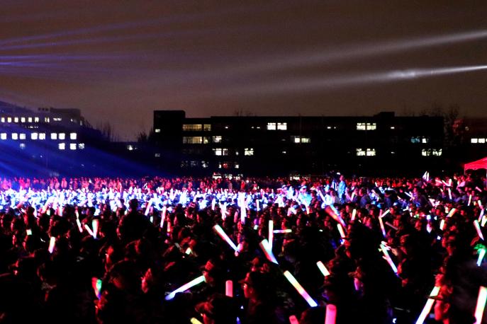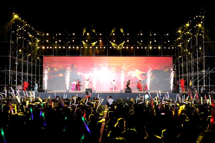 恰逢第35个教师节,开场舞《长大后我就成了你》,用翩翩舞姿向老师致敬,表达了对老师美好的祝愿。歌舞《国家》用舞蹈传递心声,用歌声诠释梦想,献礼新中国70华诞。诗朗诵《沙枣花开》深情演绎了永利集团304官网“不怕困难、不畏风寒、根深叶茂、本固枝荣”的“沙枣树”精神。武术《律动· 武魂》瞬间点燃全场,动感的节奏与精彩的表演引得现场掌声连连。星光大道2009年年度总冠军旺姆的一首《天籁之歌》把晚会推向高潮,现场虽然下起了小雨,但大家的热情不减,全体师生挥舞荧光棒与旺姆对唱,嘹亮的歌声响彻整个操场。绚丽的烟花绽放在文萃校区的夜空,晚会在歌舞《我和我的祖国》中落下帷幕。