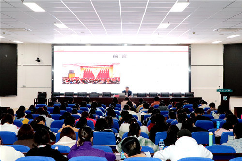 12月10日,校党委副书记王玉炯围绕党的十九届四中全会的重大意义、中国特色社会主义制度自信、《中共中央关于坚持和完善中国特色社会主义制度、推进国家治理体系和治理能力现代化若干重大问题的决定》提出的总体要求、总体目标和重点任务等方面对党的十九届四中全会精神进行了深刻解读,并传达了自治区党委十二届八次全会会议精神。他要求广大师生深入学习理解全会精神,充分认识中国特色社会主义制度的本质特征和优越性,把制度自信教育贯穿国民教育全过程,把制度自信的种子播撒进青少年心灵。守好促进民族团结、维护政治安全、改善生态环境“三条生命线”,走出一条高质量发展的新路子,确保与全国同步全面建成小康社会,努力建设好经济繁荣民族团结环境优美人民富裕的美丽新宁夏。他强调,广大教师要结合高校担负的使命任务,结合学校的发展目标定位,把思想和行动统一到四中全会精神上来,做“四有”好老师,当好学生引路人。广大青年学生要将爱国情、强国志、报国行自觉融入坚定中国特色社会主义制度自信、实现中华民族伟大复兴的奋斗之中。