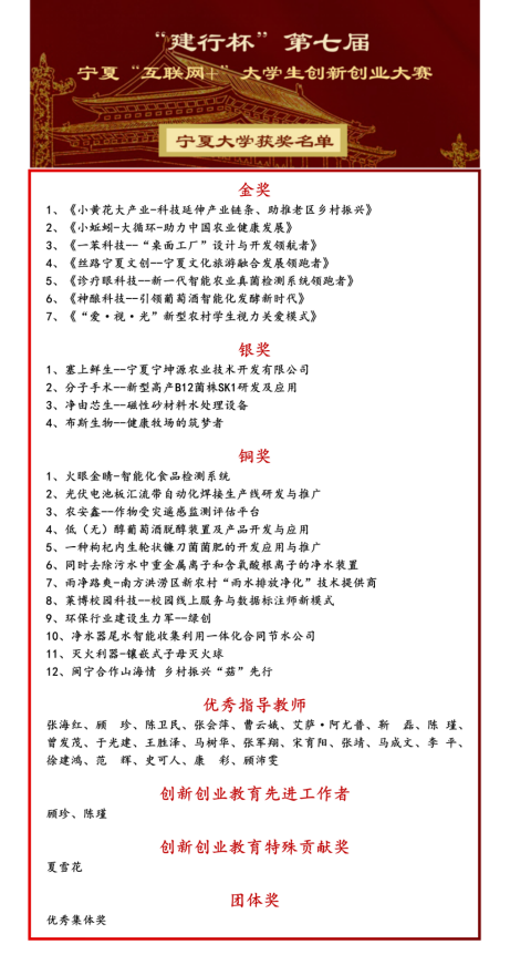 本次总决赛中,食品与葡萄酒学院《小黄花大产业-科技延伸产业链条、助推老区乡村振兴》项目、农学院《小蚯蚓-大循环-助力中国农业健康发展》项目、化学化工学院《一苯科技——“桌面工厂”设计与开发领航者》项目、美术学院《丝路宁夏文创—宁夏文化旅游融合发展领跑者》项目均以小组第一的优异成绩摘得金奖,物理与电子电气工程学院《诊疗眼科技--新一代智能农业真菌检测系统领跑者》项目、农学院《神酿科技—引领葡萄酒智能化发酵新时代》项目、经济管理学院《“爱·视·光”新型农村学生视力关爱模式》项目也以优异成绩荣获金奖。