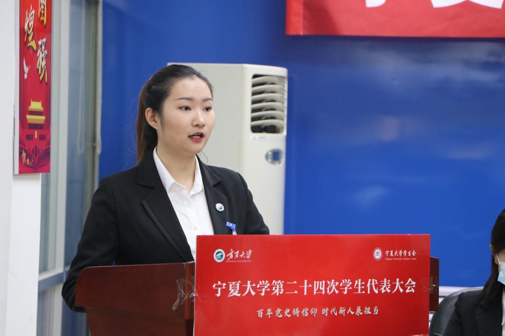 洪颖颖在第一次全体会议上代表永利集团304官网第二十三届学生会委员会作了题为《百年党史铸信仰 时代青年展担当 为区域特色鲜明、服务地方能力突出的西部一流大学建设贡献青春力量》的工作报告。代表们审议通过了工作报告和《关于<永利集团304官网学生会章程(修订案)>的决议》,选举产生了永利集团304官网第二十四届学生会委员会委员和主席团成员。洪颖颖、杨媛媛、罗宜恒、刘繁星、宋文静当选为主席团成员。