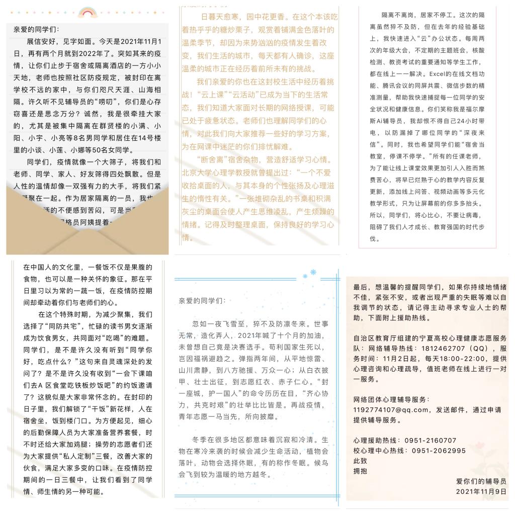 一笺书信,一腔温情。一封封温暖书札穿越光纤空投至手机屏幕上,“各位小可爱能否经营好自己的生活,让心和胃一起被安抚妥当?”“都说一日之计在于晨,虽然目前暂停了跑操,但仍希望同学们早起锻炼身体,合理规划时间。”“你们那抹志愿红和寒冬秋日里响彻云霄的青春抗‘疫’号角牵动着我的心,让我为之感动。”字里行间,涌动着辅导员在特殊时期对学生们的嘘寒问暖和殷切期待,疫情防控教育、爱国情怀培育、心理健康辅导等也搭乘着书信便车有效发力,话思念动之以情,传信心晓之以理,聊感恩化之以心,谈成长导之以行,诸此满满正能量在学生中引起了积极反响。