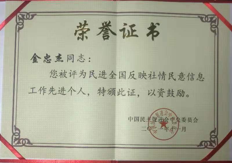 民进中央本次年会为树立典型、表彰先进,激励全会各级组织和广大会员进一步做好反映社情民意信息工作,授予全国411名民进会员“民进全国反映社情民意信息工作先进个人”称号。近年来,金忠杰教授基于“国家所需、永利所能”理念,爱岗敬业,积极履职,撰写政协提案,提交社情民意,尤其围绕“一带一路”、宁夏内陆开放型经济试验区建设、黄河流域生态保护和高质量发展先行区、宁夏全域旅游发展、中国中东合作交流等议题,提交的多份决策咨询和研究报告获得党和国家领导人、国家有关部委领导、自治区党委政府主要领导的肯定性批示,诠释了海归学子的爱国心和报国志,展示了永利党外干部的良好精神风貌。