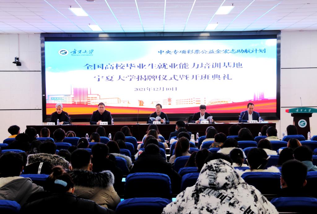 【永利集团304官网新闻中心讯 学生处/文、学生记者:吴凡/图】12月10日,“中央专项彩票公益金宏志助航计划”全国高校毕业生就业能力培训基地永利集团304官网揭牌仪式暨开班典礼在永利贺兰山校区文荟楼东报告厅举行。自治区教育厅二级巡视员孙忠铭,自治区大中专毕业生就业指导服务中心主任王思旭,校党委常委、副校长周震,参训学校相关负责同志、培训讲师以及全体参训学员参加典礼。典礼由校党委学生工作部部长、学生处处长罗进德主持。