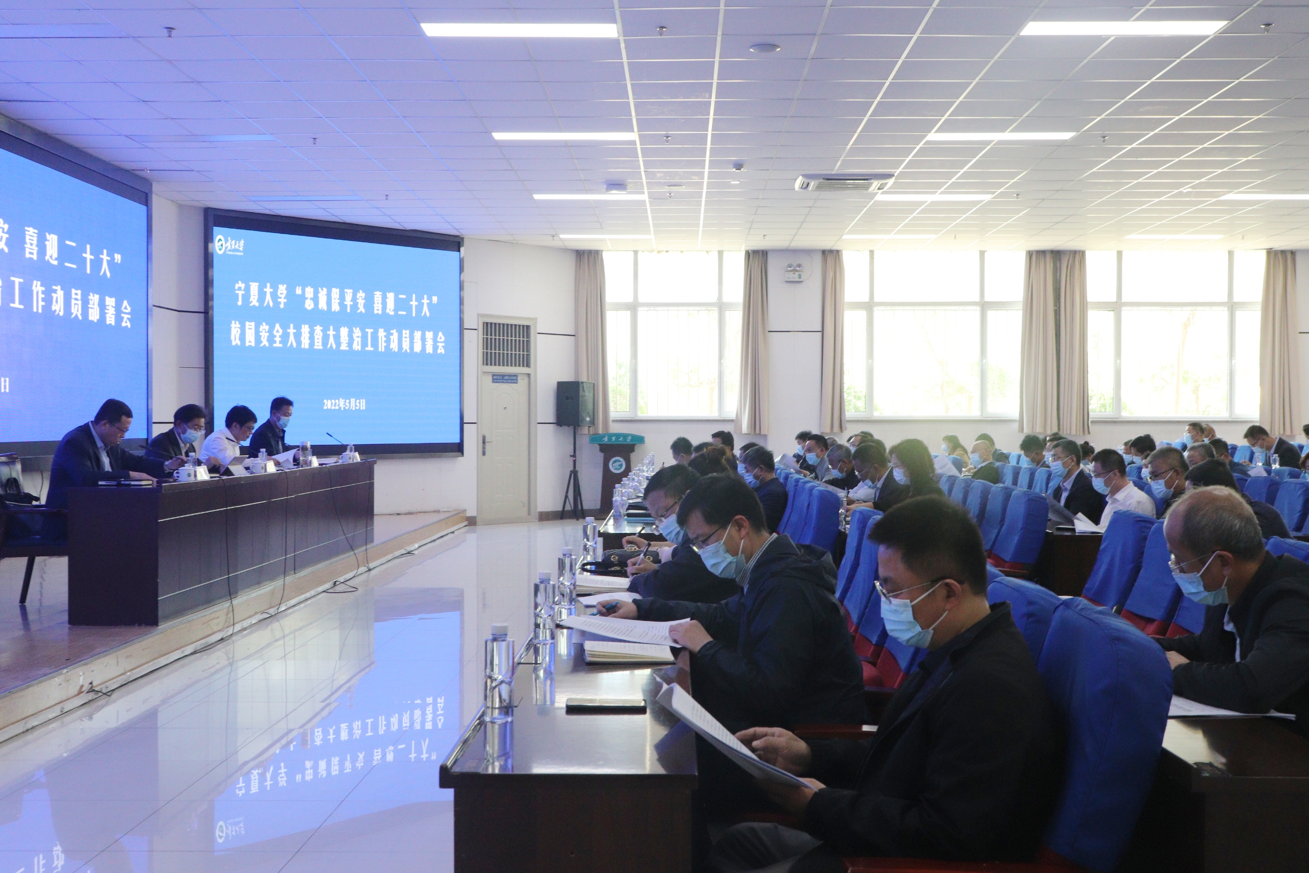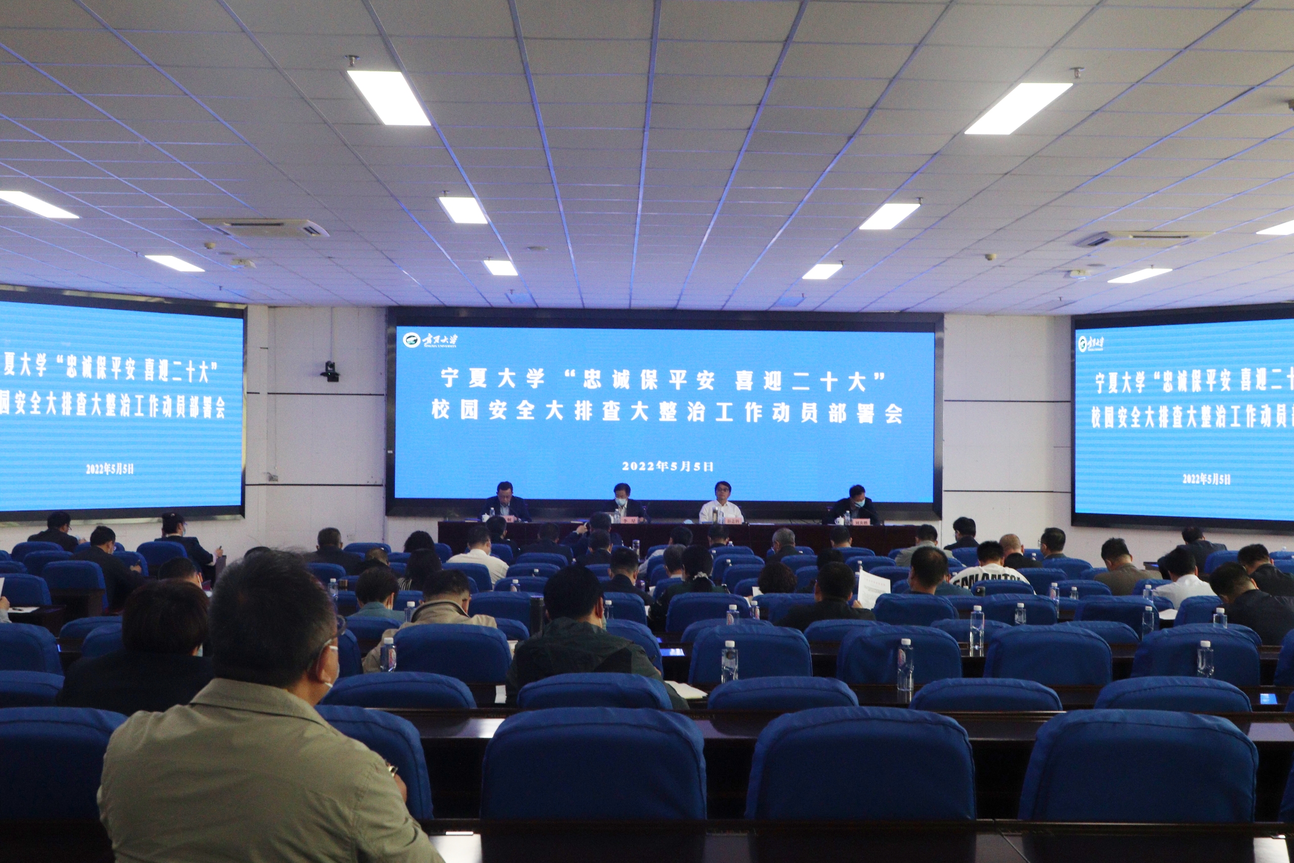 【永利集团304官网新闻中心讯 王文娣/文、图】为全力构建平安和谐校园,切实维护师生生命安全和身体健康,努力把永利建设成为安全稳定的模范之地,为党的二十大和自治区第十三次党代会的胜利召开营造良好的校园环境,5月5日,永利在贺兰山校区文荟楼一楼东报告厅召开“忠诚保平安 喜迎二十大”校园安全大排查大整治工作动员部署会。全体校领导出席会议,校党委副书记、校长彭志科主持会议。