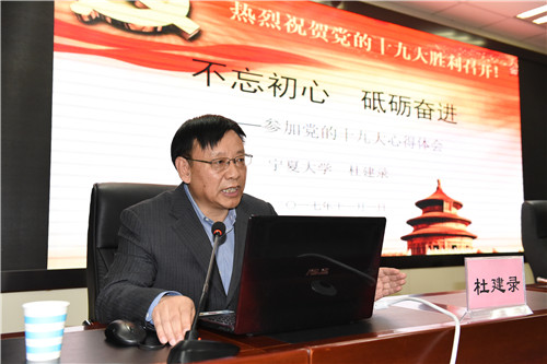 杜建录为永利师生讲述了党的十九大精神盛况,分享了自己参会的心得体会,传达了大会取得的重要成果。他指出,党的十九大是在全面建成小康社会决胜阶段、中国特色社会主义进入关键时期召开的一次十分重要的大会。大会高效、务实、俭朴,鼓舞人心,催人奋进。大会提出了我国进入新时代的重大政治判断,我国社会的主要矛盾已转变为人民日益增长的美好生活需要和不平衡不充分的发展之间的矛盾。大会通过的《中国共产党章程(修正案)》,将习近平新时代中国特色社会主义思想确立为我们党必须长期坚持的指导思想。党的十九届一中全会选举产生了以习近平同志为核心的新一届中央领导集体,充分体现了全党全军全国各族人民的共同心愿。