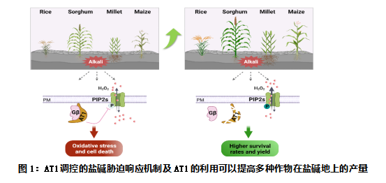 本研究首次发现主效耐碱基因AT1通过调控水通道蛋白的磷酸化来调节在逆境情况下水通道蛋白的活性,并将逆境导致产生的ROS(活性氧物质)泵到细胞外降低过氧化应激,揭示了高等生物高抗盐碱的分子机制。为进一步检验AT1基因的改造对作物在耐盐碱地上产量的影响,在宁夏平罗盐碱地和吉林大安进行了大田实验,发现基于耐盐碱等位基因AT1/GS3改良的水稻、玉米、高粱和谷子均有效提高了约20-30%的产量和生物量,在作物耐碱育种方面具有巨大的应用前景,有望为支撑我国粮食安全中盐碱地综合利用国家战略发挥重要作用。