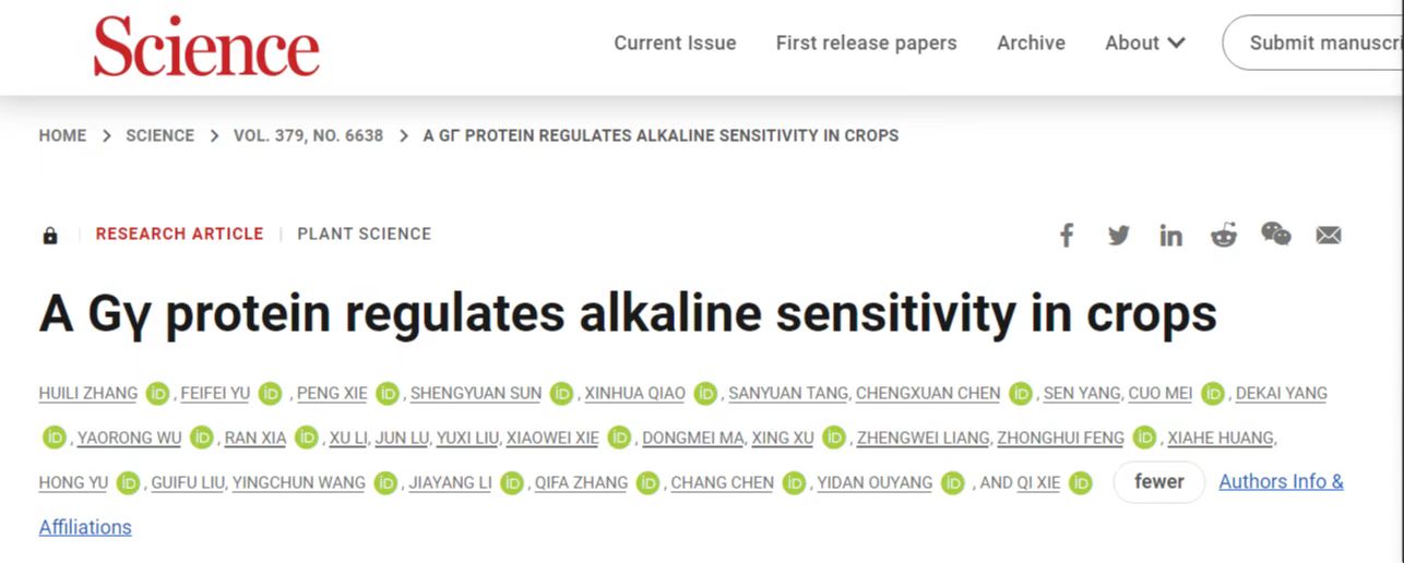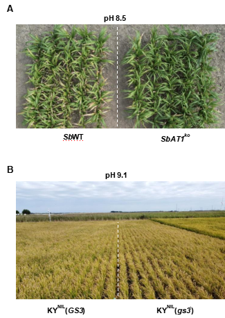【永利集团304官网新闻中心讯 通讯员:麻冬梅】3月24日,永利集团304官网(第二完成单位)与中国科学院遗传与发育生物学研究所在国际学术期刊《科学》(IF=63.7)在线发表题为《A Gy protein regulates alkaline sensitivity in crops》的研究论文。该研究以耐盐碱作物高粱为材料首次发现农作物耐碱基因AT1及其作用机制,大田实验证明该基因可显著提升高粱、水稻、谷子和玉米等耐盐碱作物种质产量,在改良盐碱地综合利用中具有重大应用前景。这是永利集团304官网首次以第二完成单位在《科学》刊发研究成果,实现了科研工作的历史性突破,是重大科技原创成果。
