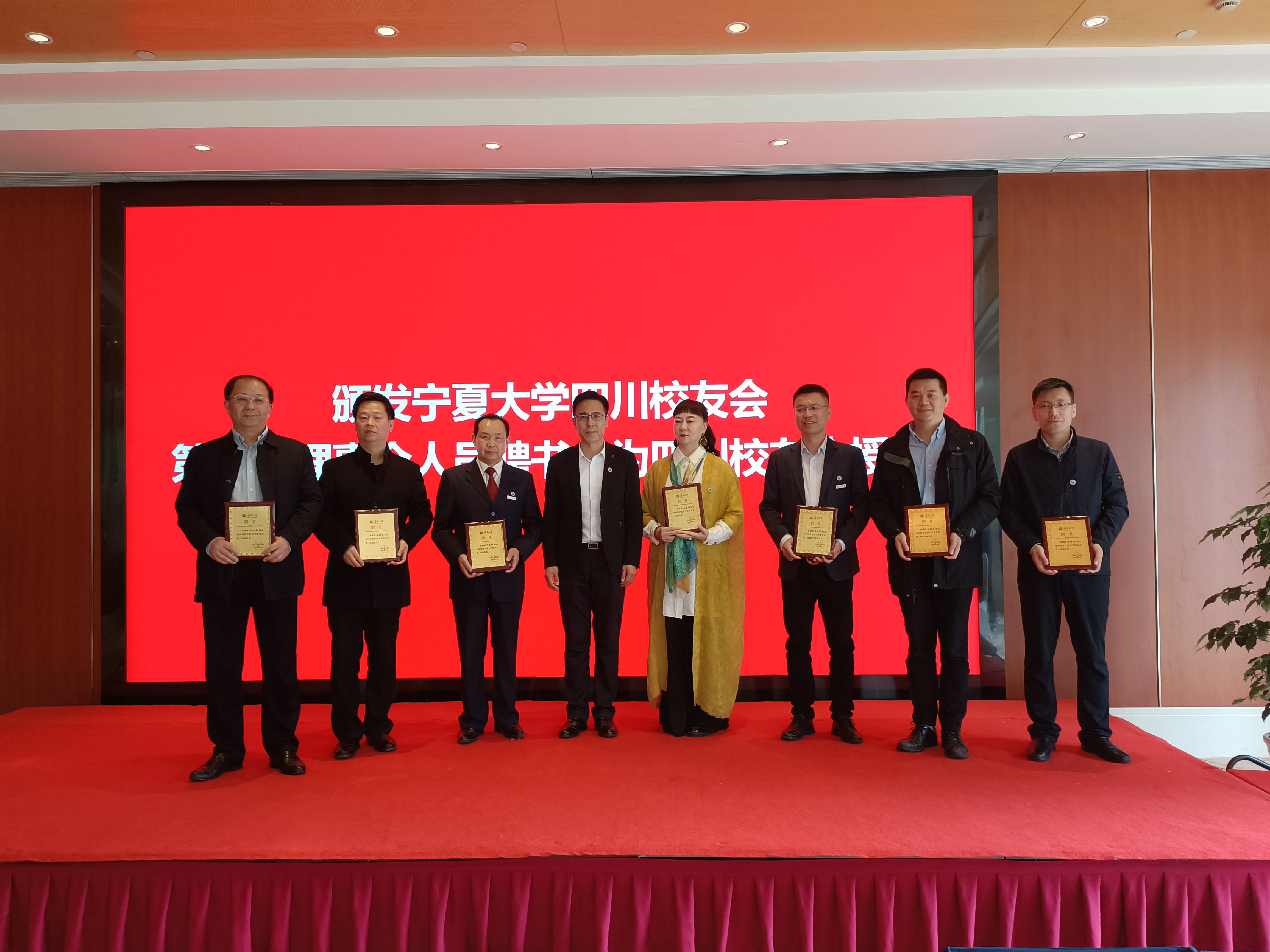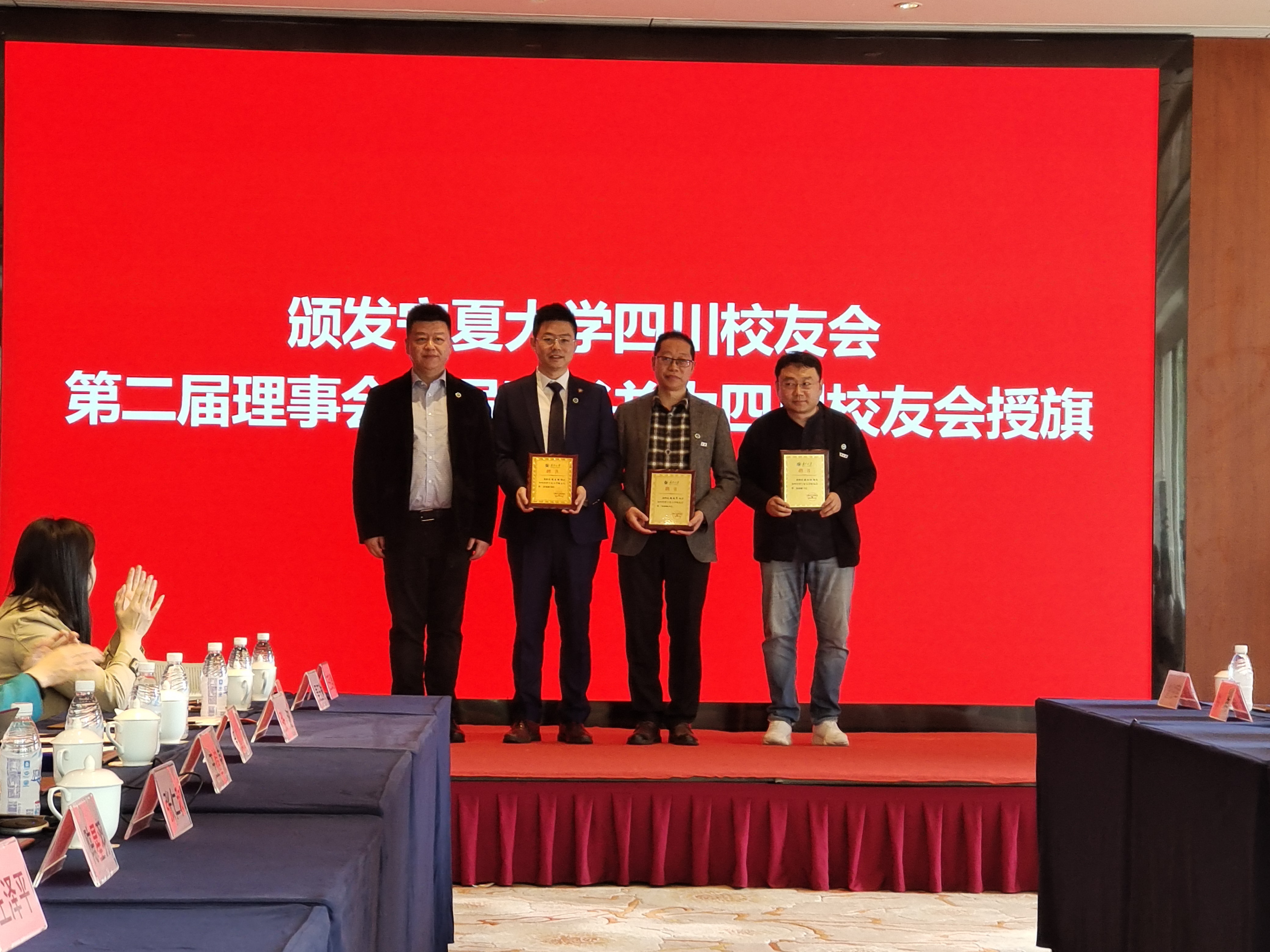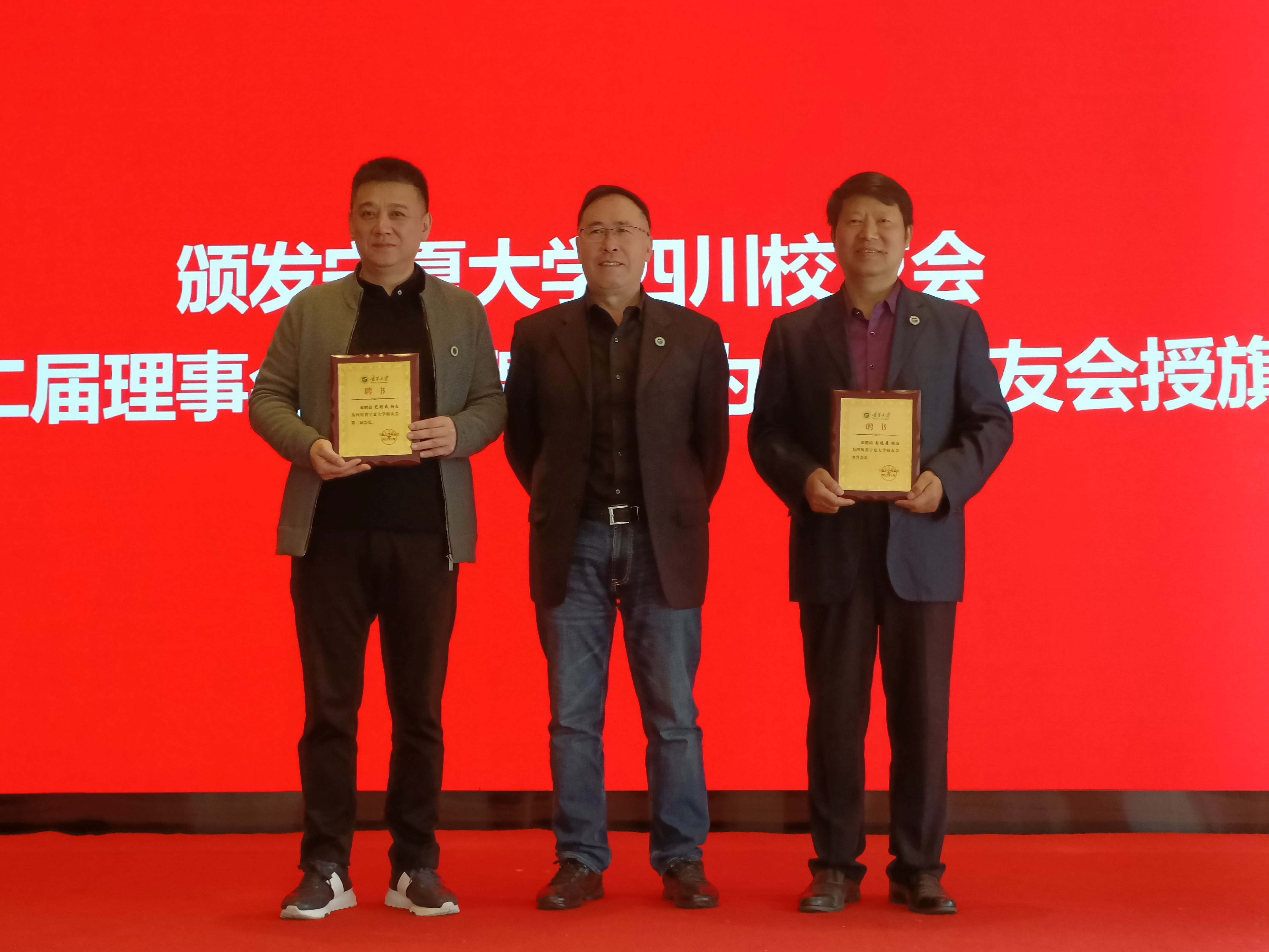 谢应忠为四川校友会名誉会长、会长颁发聘书,谢应忠、高永兴为新一届理事会授旗,高永兴、衡亮为第二届理事会副会长、秘书长、副秘书长颁发聘书。