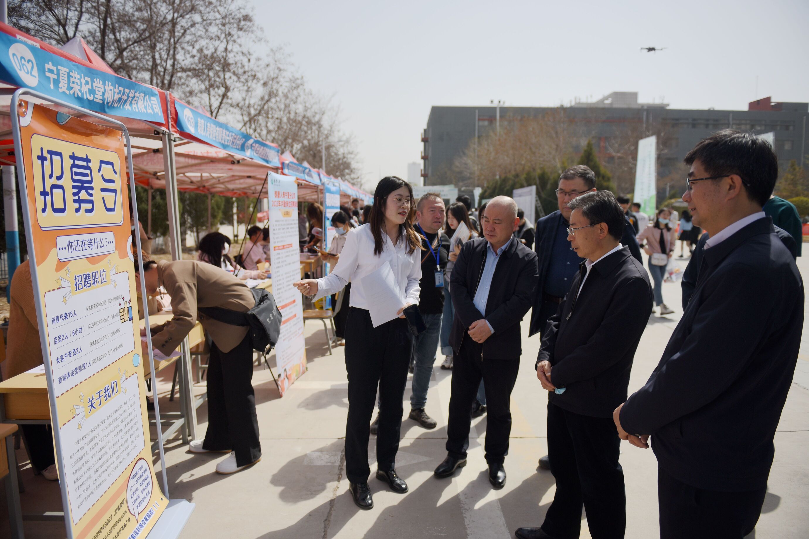 双选会现场气氛热烈,秩序井然。现场设立了温馨服务台、简历门诊、政策咨询等多个服务平台,为到场的毕业生发放资料并讲解引才政策。校党委书记李星,校党委副书记周震,校党委常委、副校长史金龙,校党委常委、宣传部部长高永兴,自治区大中专毕业生就业服务指导中心主任王思旭在学生处相关负责人的陪同下专门来到双选会现场,同海尔智家股份有限公司、杭州景杰生物科技股份有限公司、宁夏天元锰材料研究院等用人企业深入交谈,询问了解招聘条件、岗位类别、薪资待遇等情况,现场向企业推荐毕业生。参加双选会的毕业生根据自身专业及用人单位招聘需求,现场咨询、投递简历、积极求职,部分毕业生与企业现场签订就业协议,达成初步就业意向,部分毕业生等待用人单位后续的笔试、面试通知。