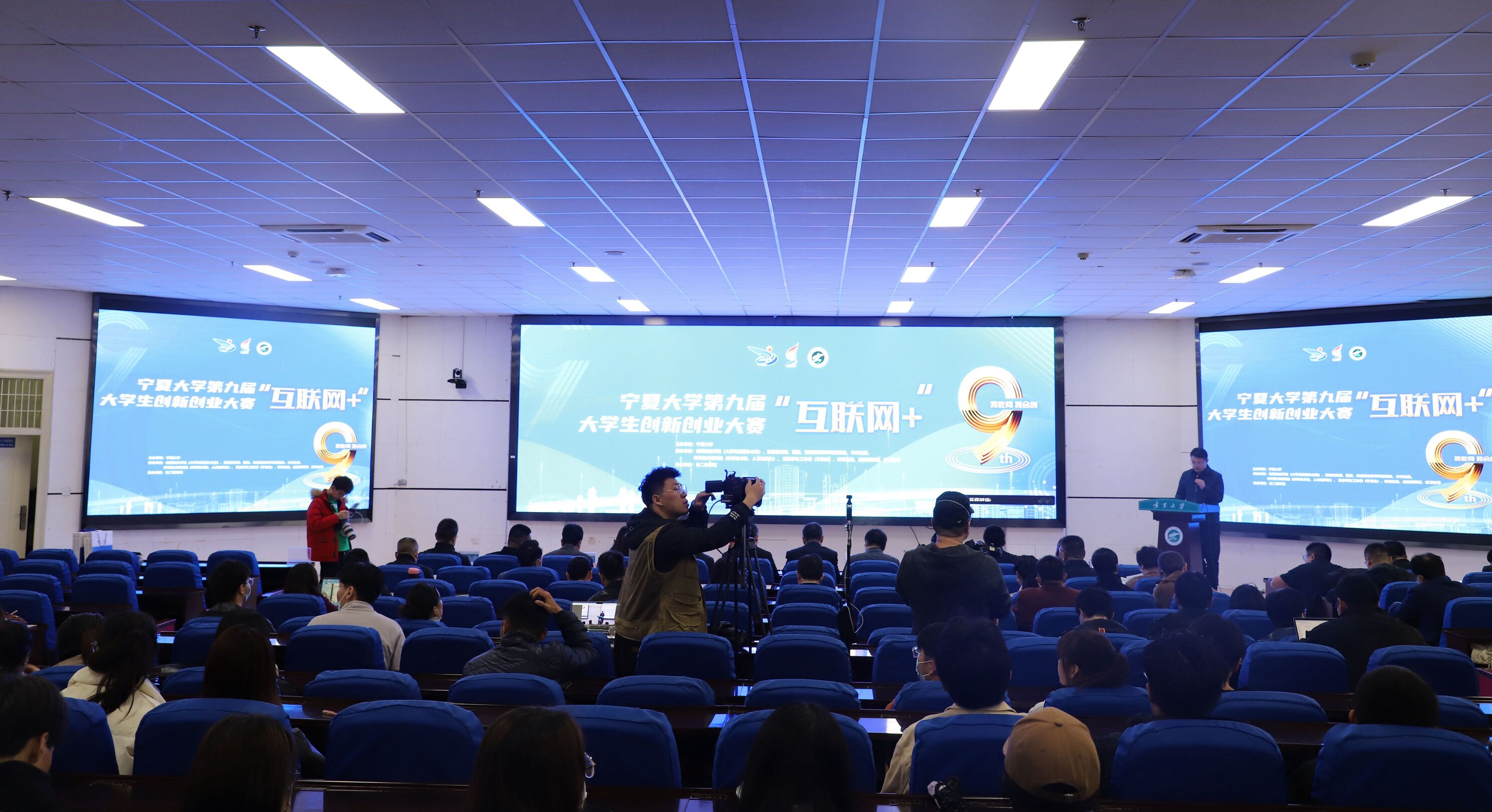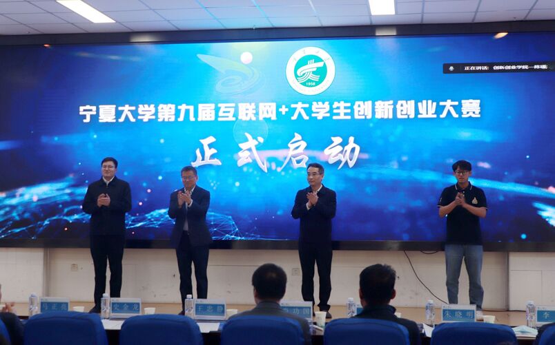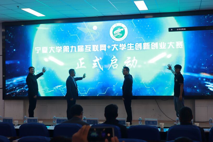 史金龙、王忠静、教师代表和学生代表共同触摸大屏,正式启动永利集团304官网第九届“互联网+”大学生创新创业大赛。