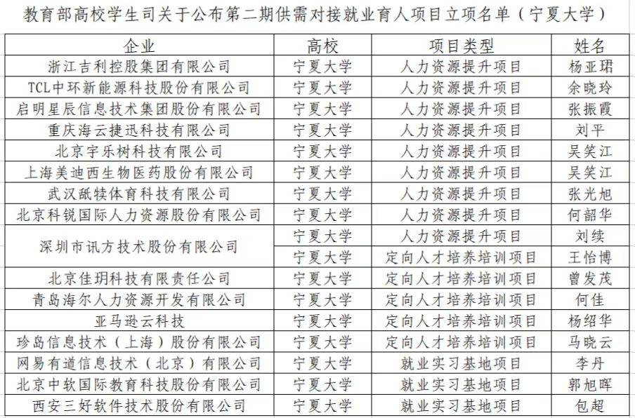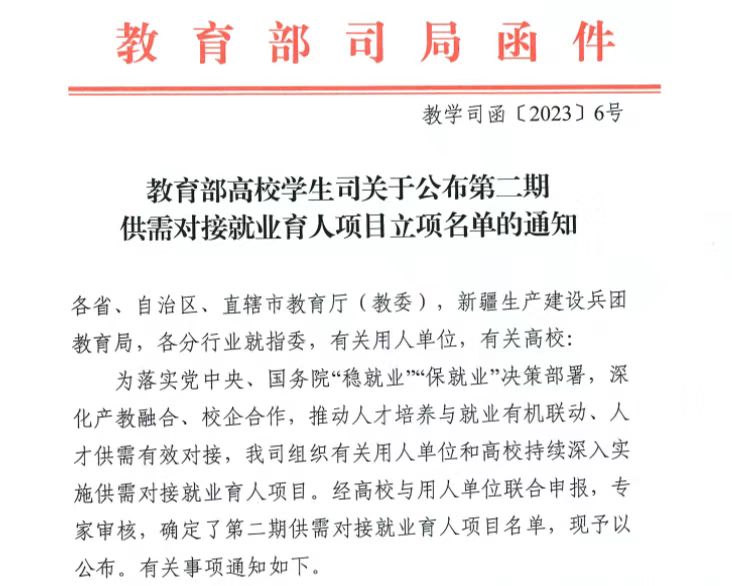 【永利集团304官网新闻中心讯 党委学生工作部】4月6日,教育部发布了《教育部高校学生司关于公布第二期供需对接就业育人项目立项名单的通知》(教学司函〔2023〕6号),永利共有17个项目获得第二期供需对接就业育人项目立项,其中人力资源提升项目9项,定向人才培养项目5项,就业实习基地项目3项。