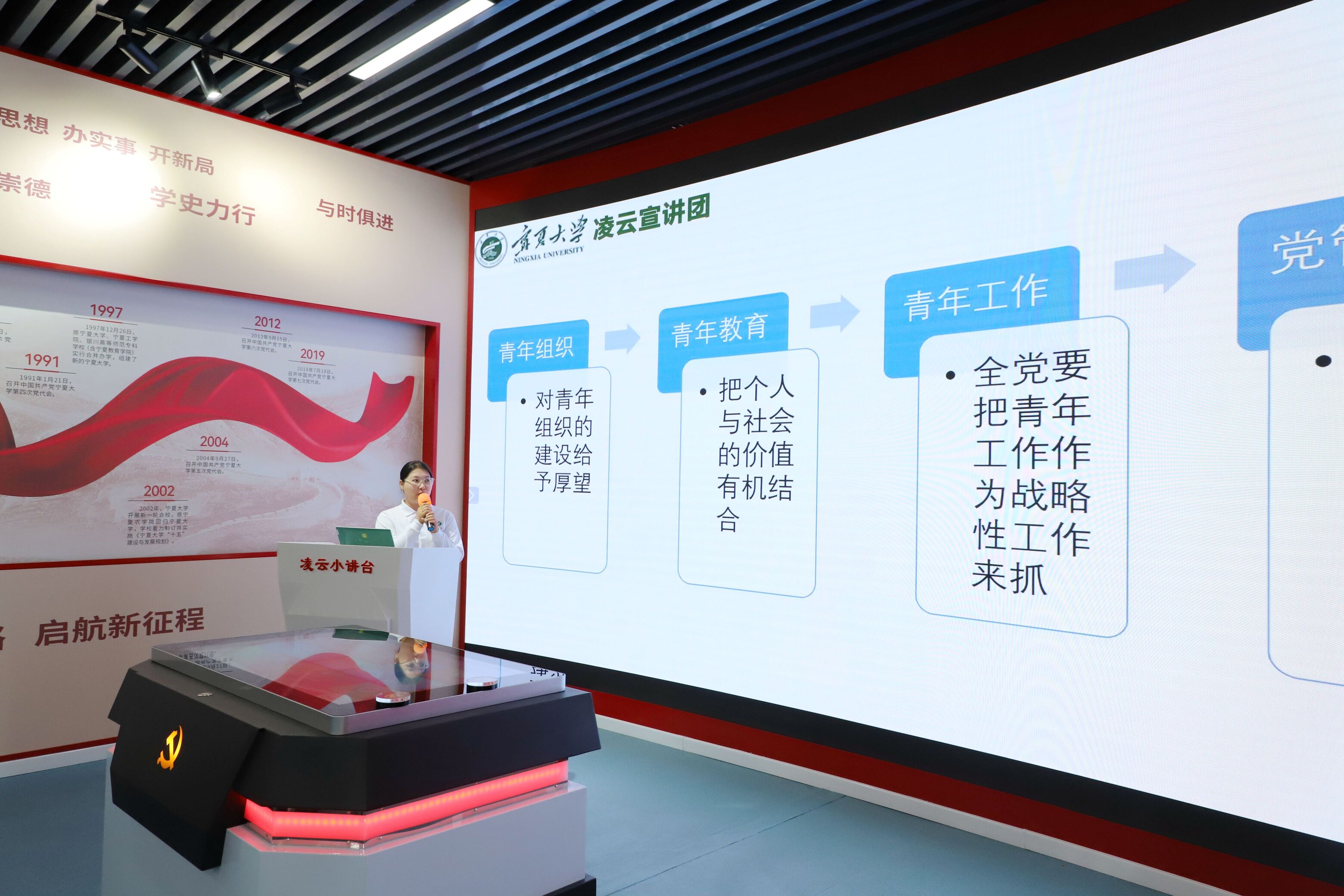 在马克思主义学院VR党建红色教育基地,马克思主义学院党总支书记党锐锋汇报了学院充分发挥自身特长和优势,以“党建工作”“思政课建设”“科学研究”“宣讲团服务”“基层调研”等五大行动协同推动主题教育走深走细、落地落实所做的工作。凌云宣讲团成员、2020级思政本科专业学生沙宣以“青春逢盛世,奋斗正当时——学习领悟习近平总书记的青年观”为题给观摩人员带来一堂“正青春”的微党课。