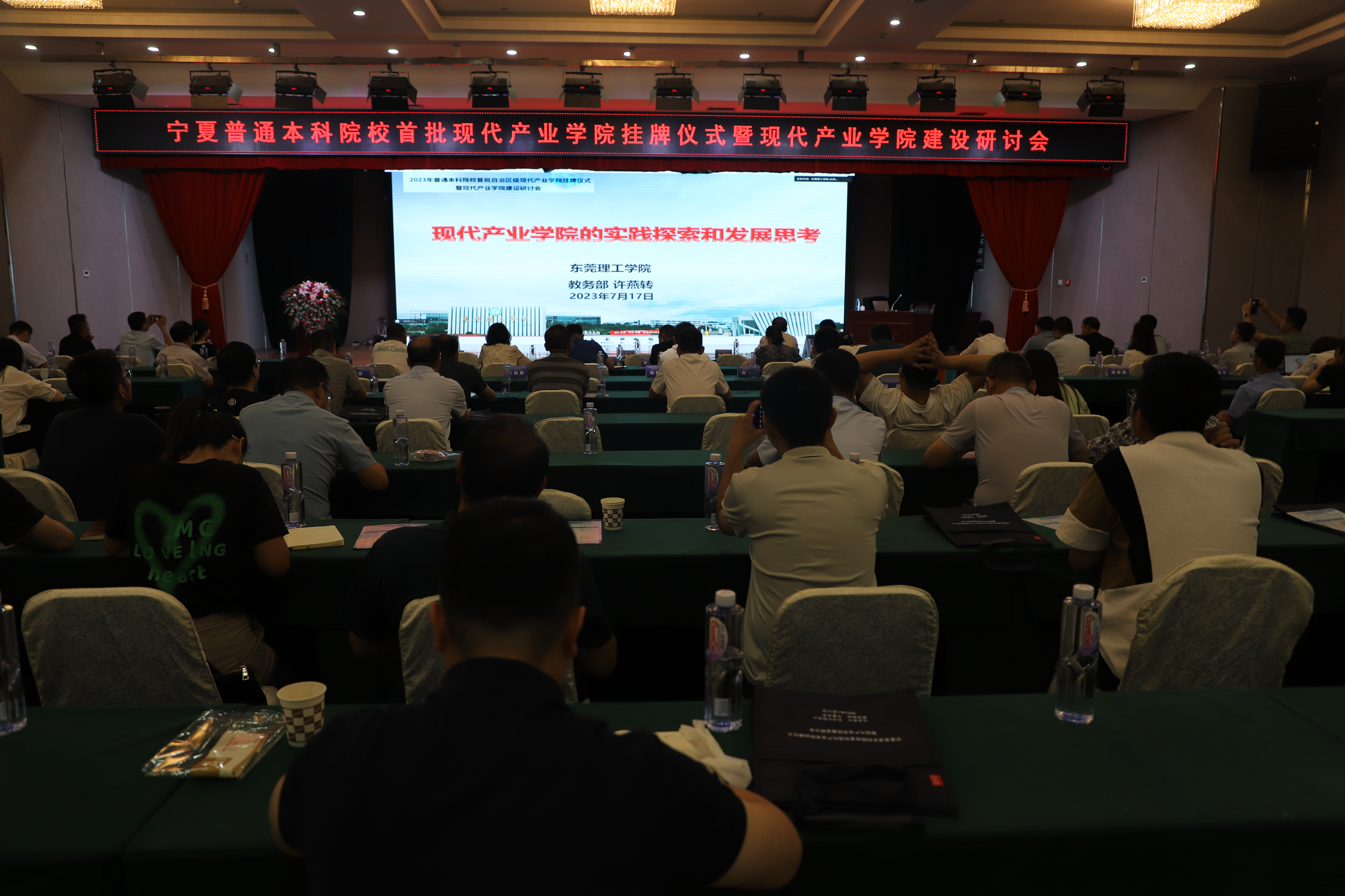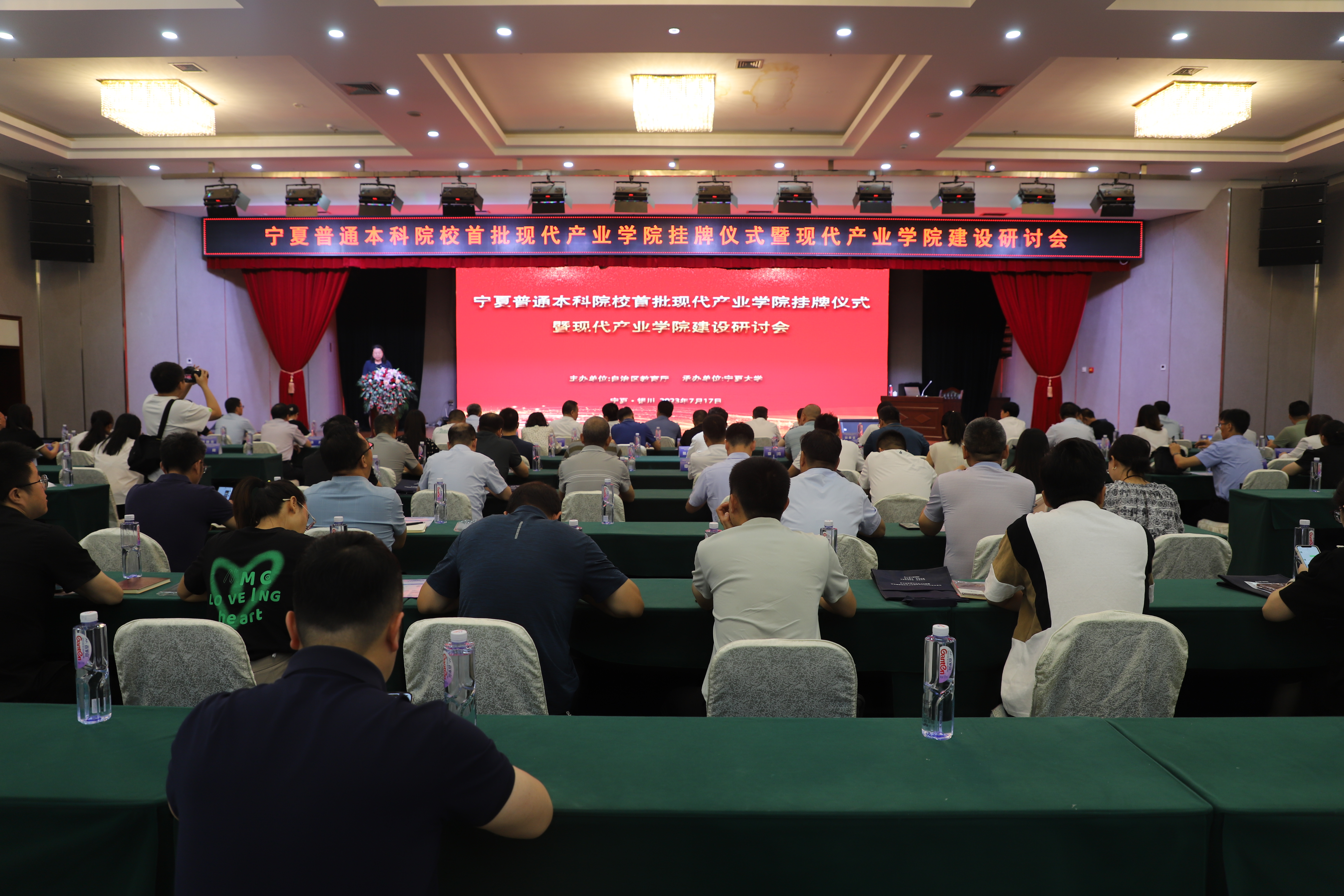 【永利集团304官网新闻中心讯 李明花/文、图】7月17日,由自治区教育厅主办、永利集团304官网承办的宁夏普通本科院校首批现代产业学院挂牌仪式暨现代产业学院建设研讨会在永利集团304官网国际交流中心召开。自治区发展和改革委员会二级巡视员邱新华,自治区教育厅副厅长吴保军,自治区教育厅二级巡视员翟家驹,校党委常委、副校长李建设,北方民族大学副校长陈永奎,宁夏师范学院副校长田富军,宁夏理工学院副校长郭莹,银川能源学院副校长张九鼎,银川科技学院副校长景天时,新华学院副院长李胜宾,宁夏百瑞源枸杞有限公司董事长郝向峰,中宁枸杞创新研究院执行院长余君伟等18家企业的代表出席开幕式。