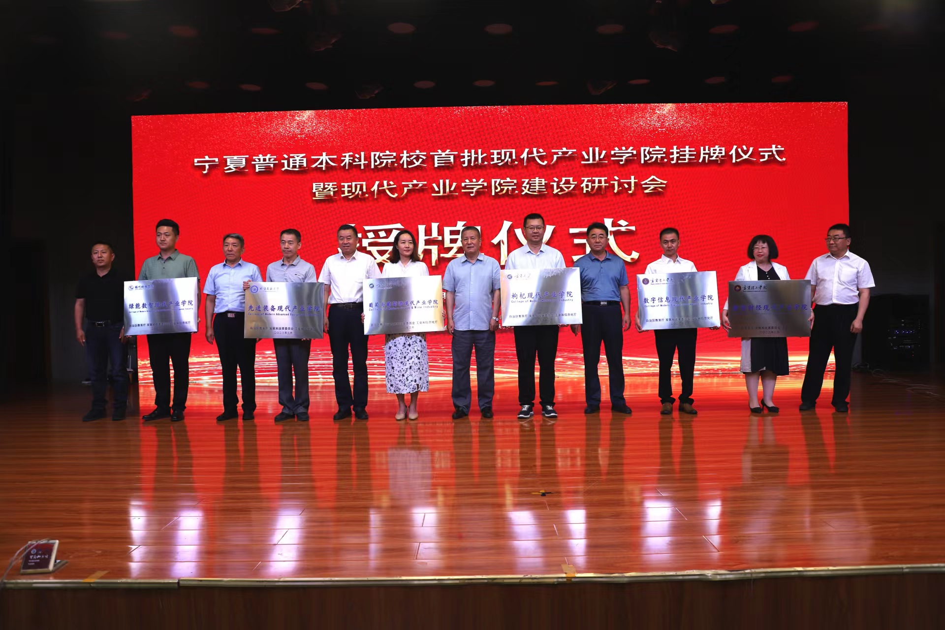 与会领导为银川科技学院绿能数智现代产业学院、北方民族大学先进装备现代产业学院、永利集团304官网葡萄与葡萄酒现代产业学院、永利集团304官网枸杞现代产业学院、宁夏理工学院数字信息现代产业学院、宁夏理工学院数智财经现代产业学院授牌。