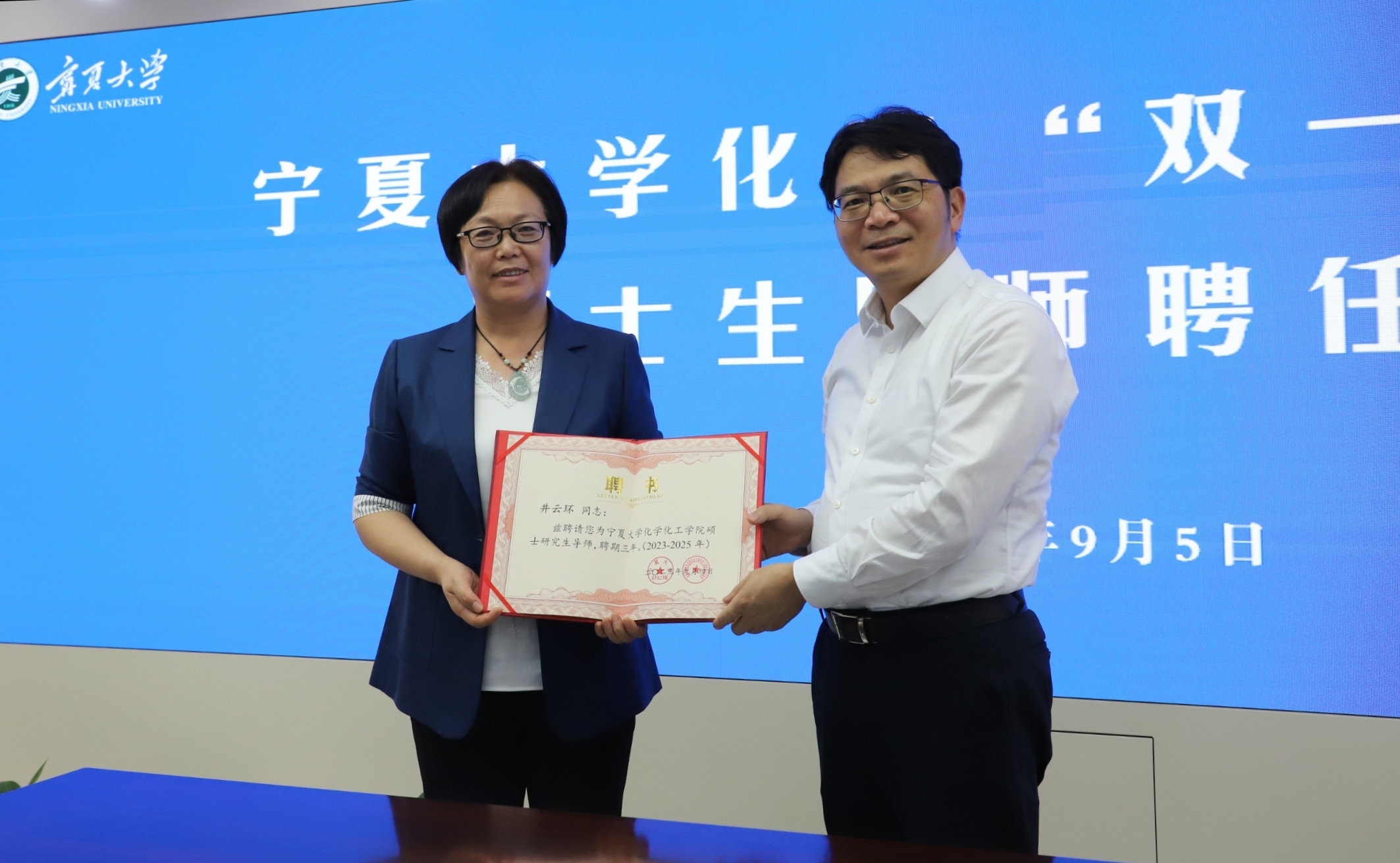 【永利集团304官网新闻中心讯 王文娣/文、图】9月5日下午,永利在贺兰山校区德勤楼举行化工“双一流”学科硕士生导师聘任仪式。校党委副书记、校长彭志科,学术副校长、化学化工学院院长罗正鸿,国能集团宁煤煤化工研究院副院长袁炜,纪委书记、副院长雍晓静,副总工程师井云环、庄壮出席聘任仪式。化学化工学院党总支书记、常务副院长张鹏飞主持仪式。