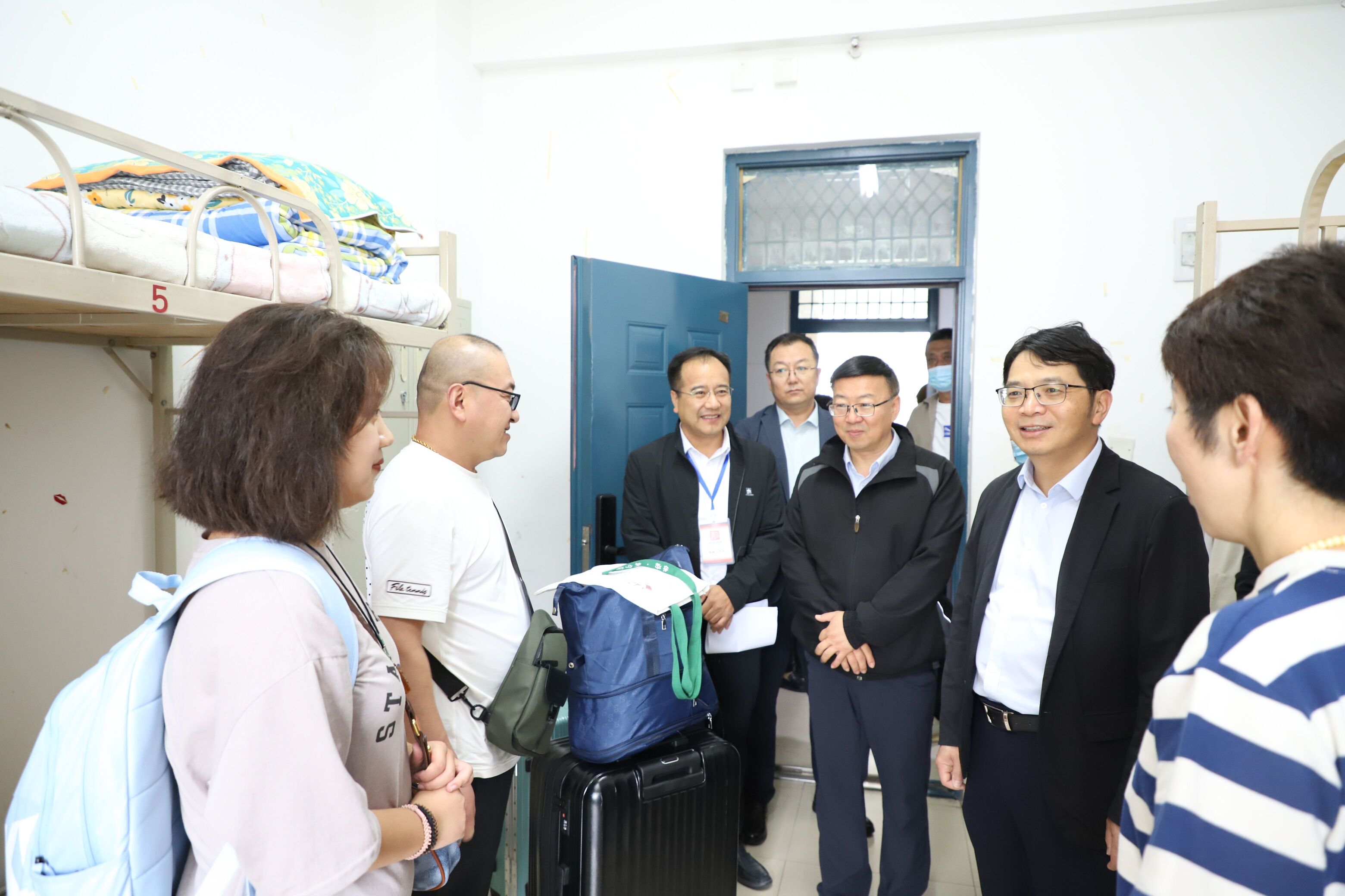 在贺兰山校区迎新报到点,彭志科一行向负责新生报到工作的各书院、学院老师及志愿者们详细了解了新生报到流程及相关信息,并前往兰山公寓1号楼查看新生住宿环境,询问了新生服务保障工作落实情况,并与新生及家长进行亲切交谈。彭志科一行还检查了兰馨苑餐厅及国贸超市开学准备情况、校园绿化改造情况等。