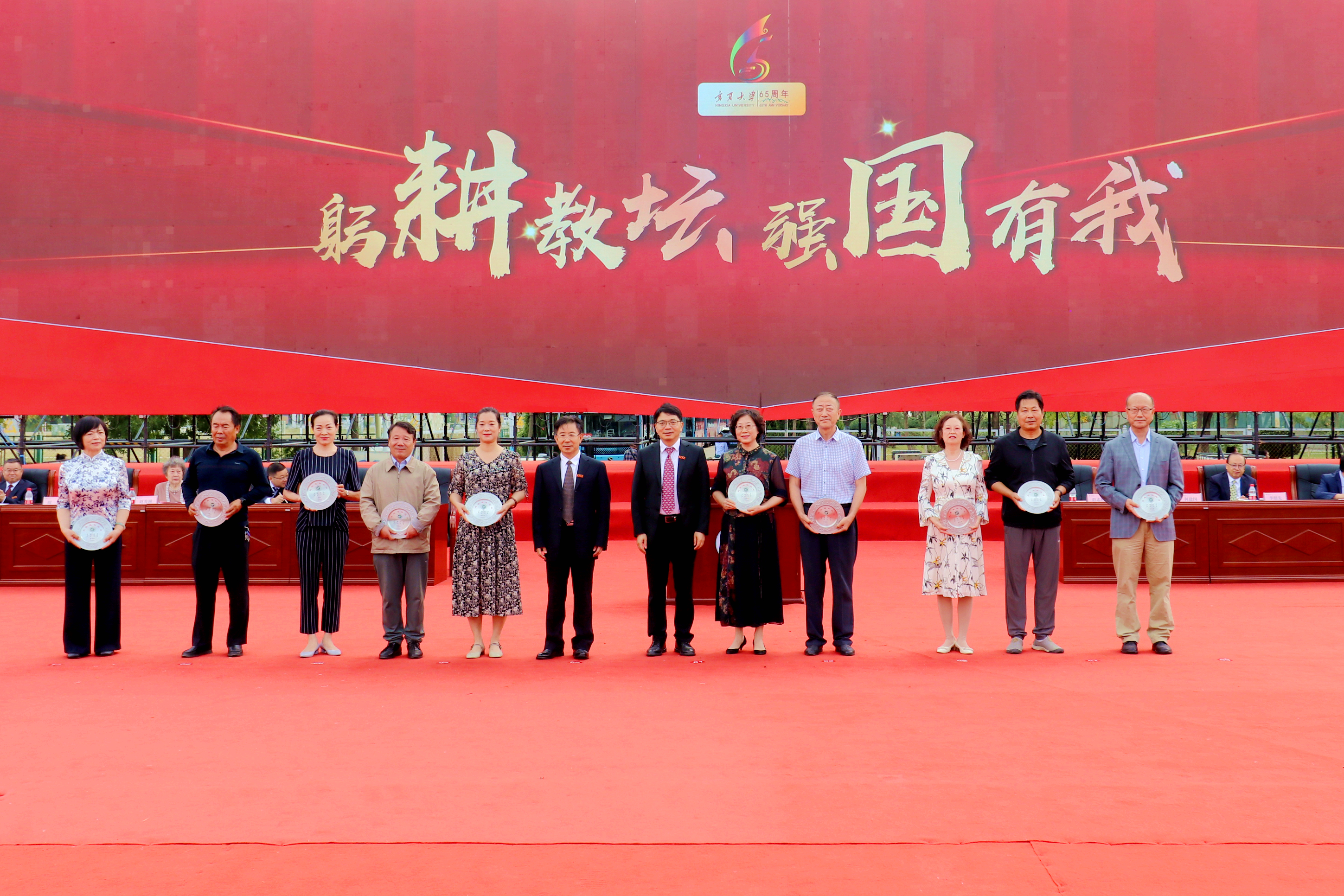 校领导和与会嘉宾为获得全国青年教师教学基本功大赛和全国高校教学创新大赛二等奖以上教师,获得全区教育工作先进个人和优秀教师,获得自治区高等学校教学成果特等奖、一等奖获奖教师代表颁奖;为获得宁夏第四届哲学社会科学突出贡献奖和第十五届哲学社会科学优秀成果奖一等奖,自治区科技进步奖一等奖、二等奖教师颁奖;为获得立德树人岗位标兵、立德树人楷模、立德树人突出贡献奖获奖教师颁奖;为从教满35 年教师代表颁发荣誉证书、纪念牌;为 2022—2023年度荣休教师代表颁发纪念牌。