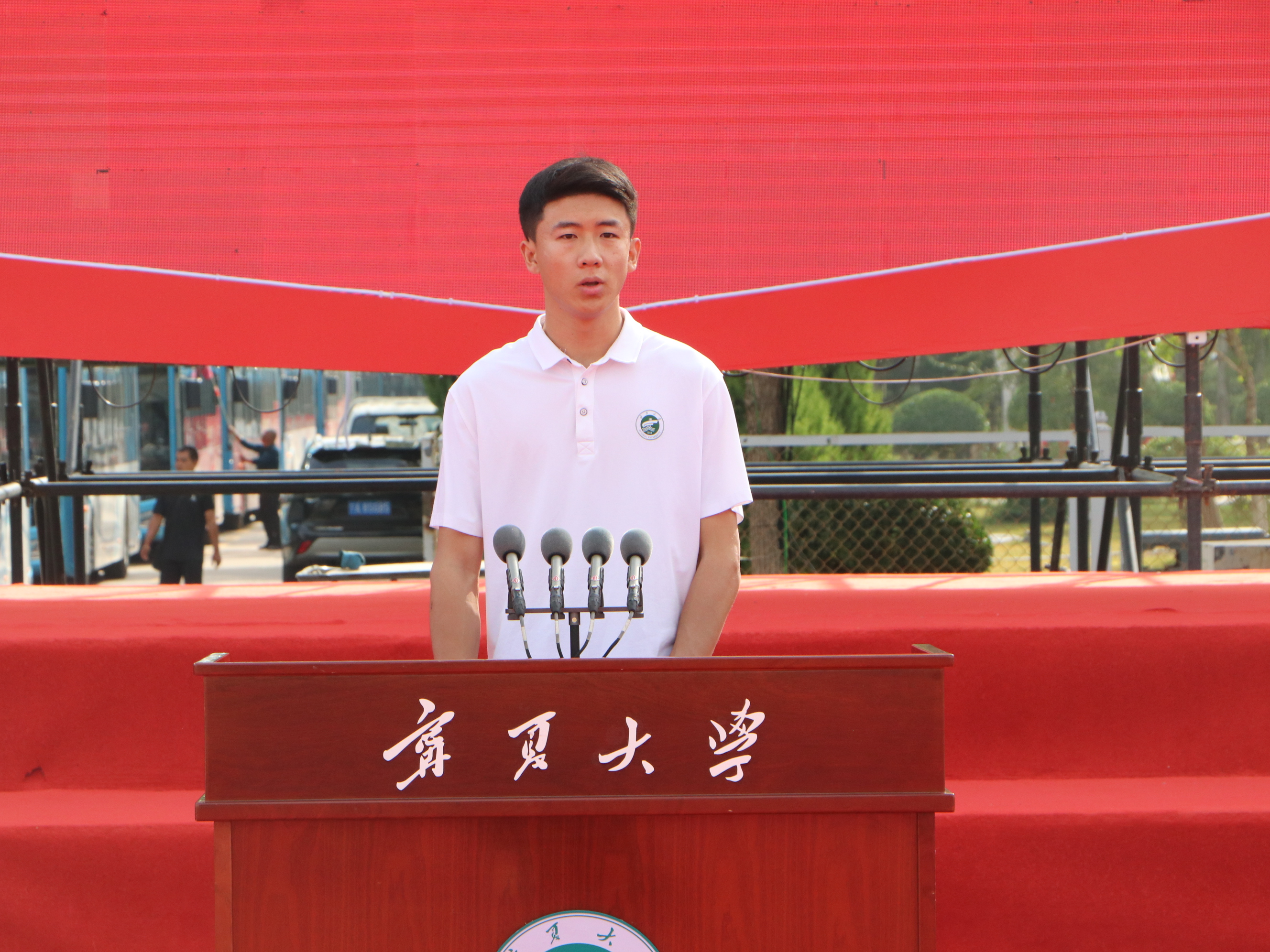 “五年前的今天,正值建校 60 周年,我作为一名新生参加了校庆和开学典礼。在这五年的时间里,我有幸见证了学校不断前行的坚实步履,看到了在深化综合改革、推动高质量发展的进程中跑出了永利集团304官网‘加速度’”。新生代表、电子与电气工程学院 2023 级电子科学与技术专业硕士研究生肖博文结合自己的社会实践活动经历和在学校的生活学习经历,号召同学们握好“不怕困难,不畏风寒,根深叶茂,本固枝荣”的“沙枣树精神”接力棒,牢记习近平总书记的谆谆教导,立志做有理想、敢担当、能吃苦、肯奋斗的新时代好青年,让青春在强国建设和民族复兴的火热实践中绽放绚丽之花。