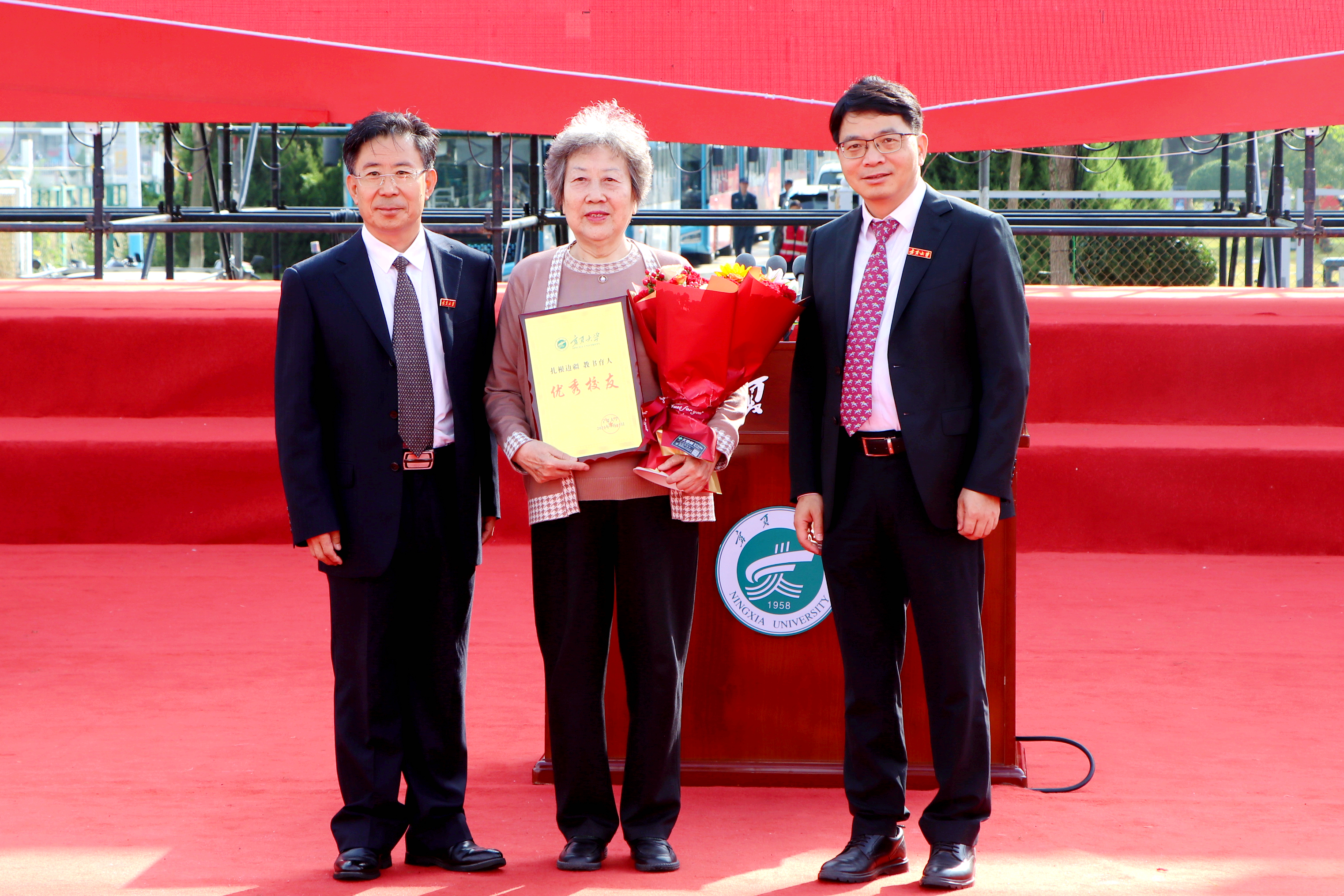 大会典礼上,校领导李星、彭志科为赵秀琳校友颁发“优秀校友纪念牌”。