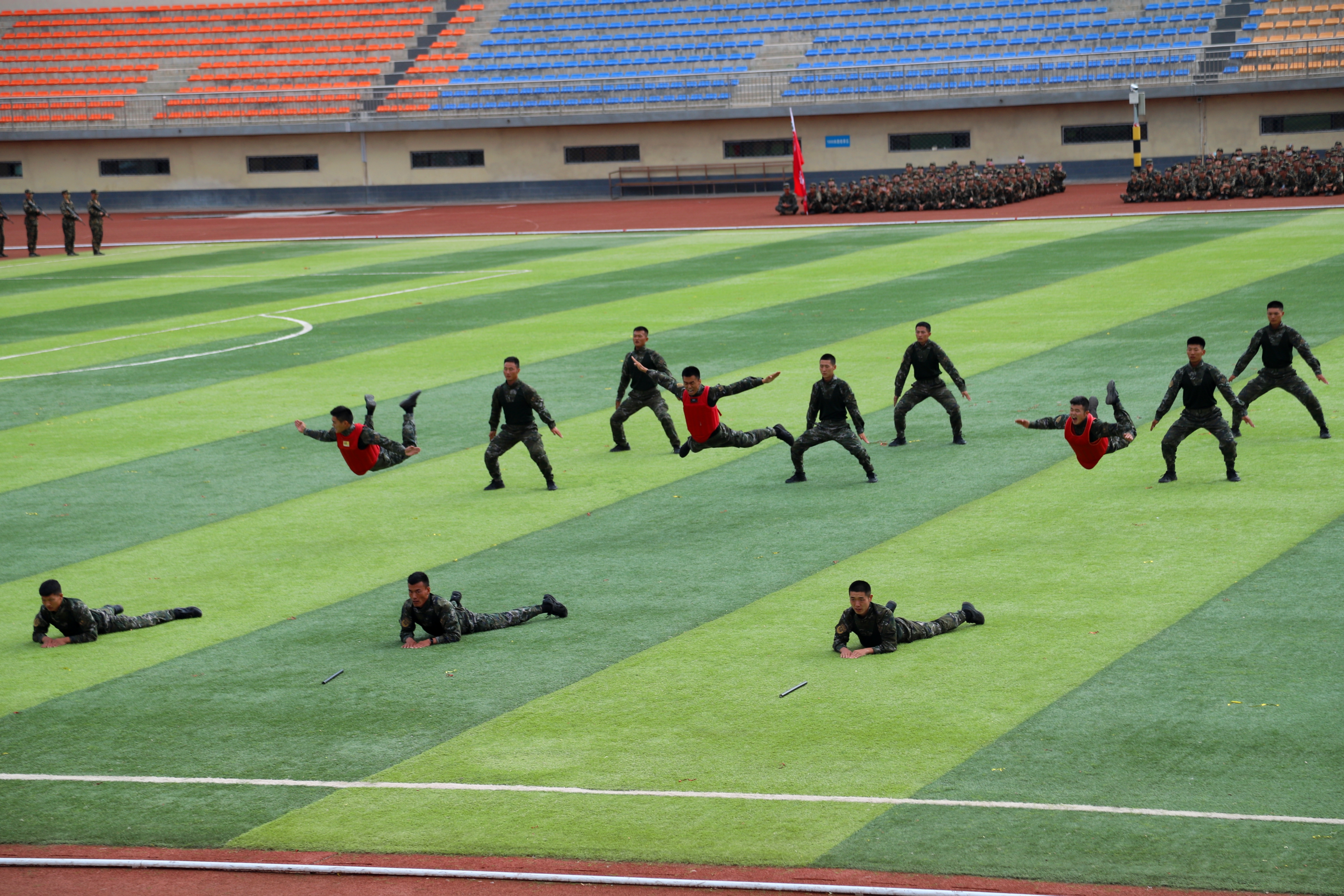 在汇报科目环节,动作流畅、秩序井然的图形变换摆演,活泼友爱、朝气蓬勃的啦啦操表演,表达了对祖国大好河山的热爱和永利集团304官网建校65周年的祝福;训练有素、招式敏捷的匕首术,气势磅礴、实战性强的擒敌拳,刚柔并济、势如破竹的刺杀操,充分体现了永利学子吃苦耐劳、顽强勇敢的意志品格;身手矫健、攻防兼备的制暴术,精进勇敢、扣人心弦的分队战术表演,彰显了人民子弟兵维护国家安全和社会稳定的强大力量;旋律悠扬、歌声嘹亮、舞姿刚劲的校歌军歌表演,将汇报科目表演推向高潮,赢得全场热烈掌声。