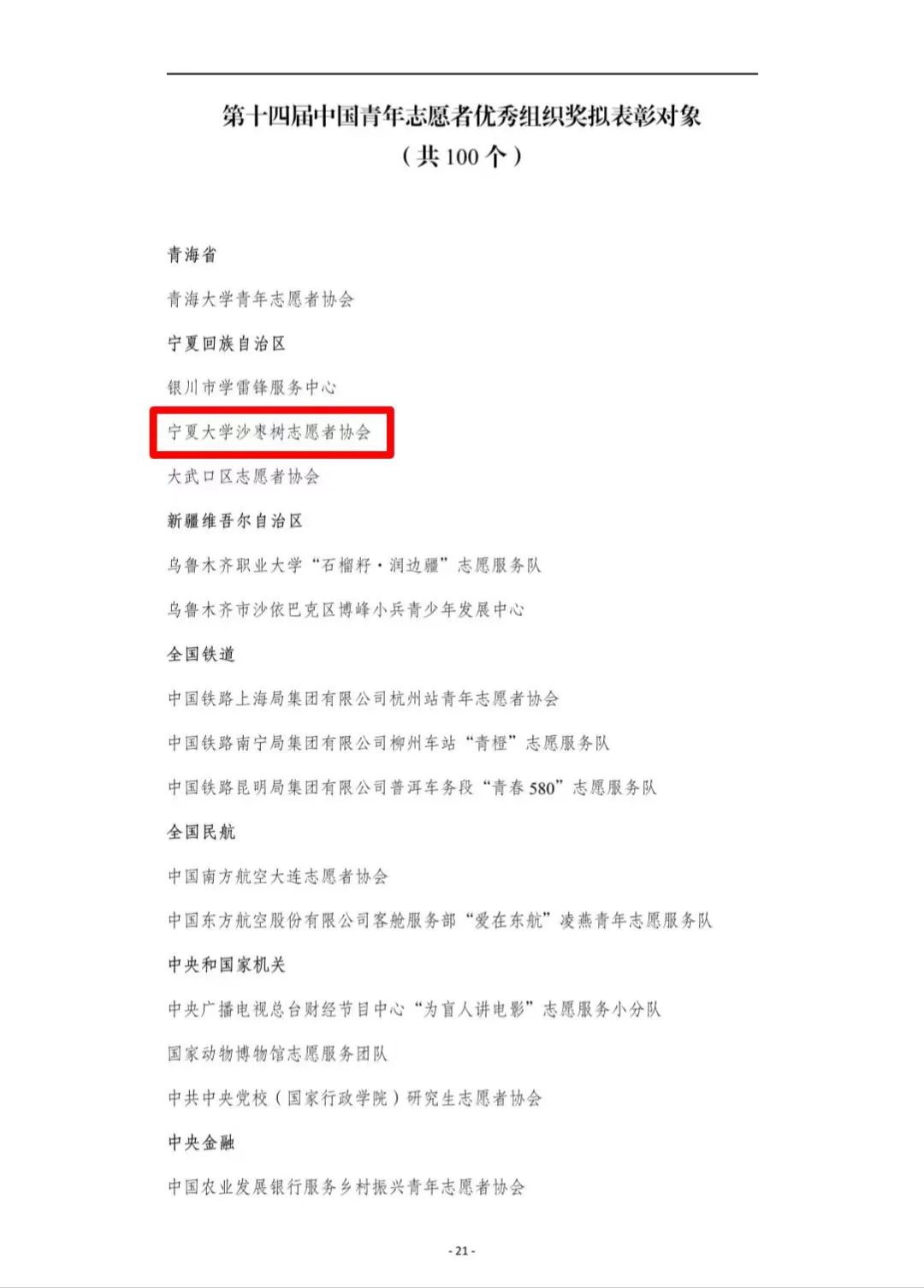 【永利集团304官网新闻中心讯 校团委】近日,共青团中央、中国青年志愿者协会作出表彰决定,授予北京2022年冬奥会、冬残奥会志愿者群体、杭州第19届亚运会和第4届亚残运会志愿者群体、成都第31届世界大学生夏季运动会志愿者群体、第一届全国学生(青年)运动会志愿者群体等260名个人(群体)第十四届“中国青年志愿者优秀个人奖”,授予浙江大学马兰红色志愿服务团等100个组织第十四届“中国青年志愿者优秀组织奖”,授予扎根计划—“三走四帮五联动”赋能乡村振兴志愿服务项目等100个项目第十四届“中国青年志愿者优秀项目奖”。永利集团304官网沙枣树志愿者协会作为宁夏唯一的高校学生组织获此殊荣。