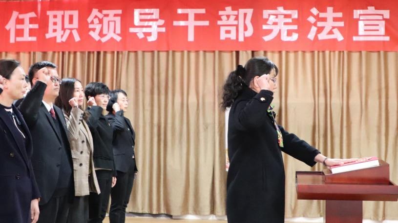 “忠于中华人民共和国宪法,维护宪法权威,履行法定职责,忠于祖国、忠于人民,恪尽职守、廉洁奉公,接受人民监督,为建设富强民主文明和谐美丽的社会主义现代化强国努力奋斗!”奏唱完国歌后,领誓人手抚宪法,领诵誓词,全体人员跟诵。