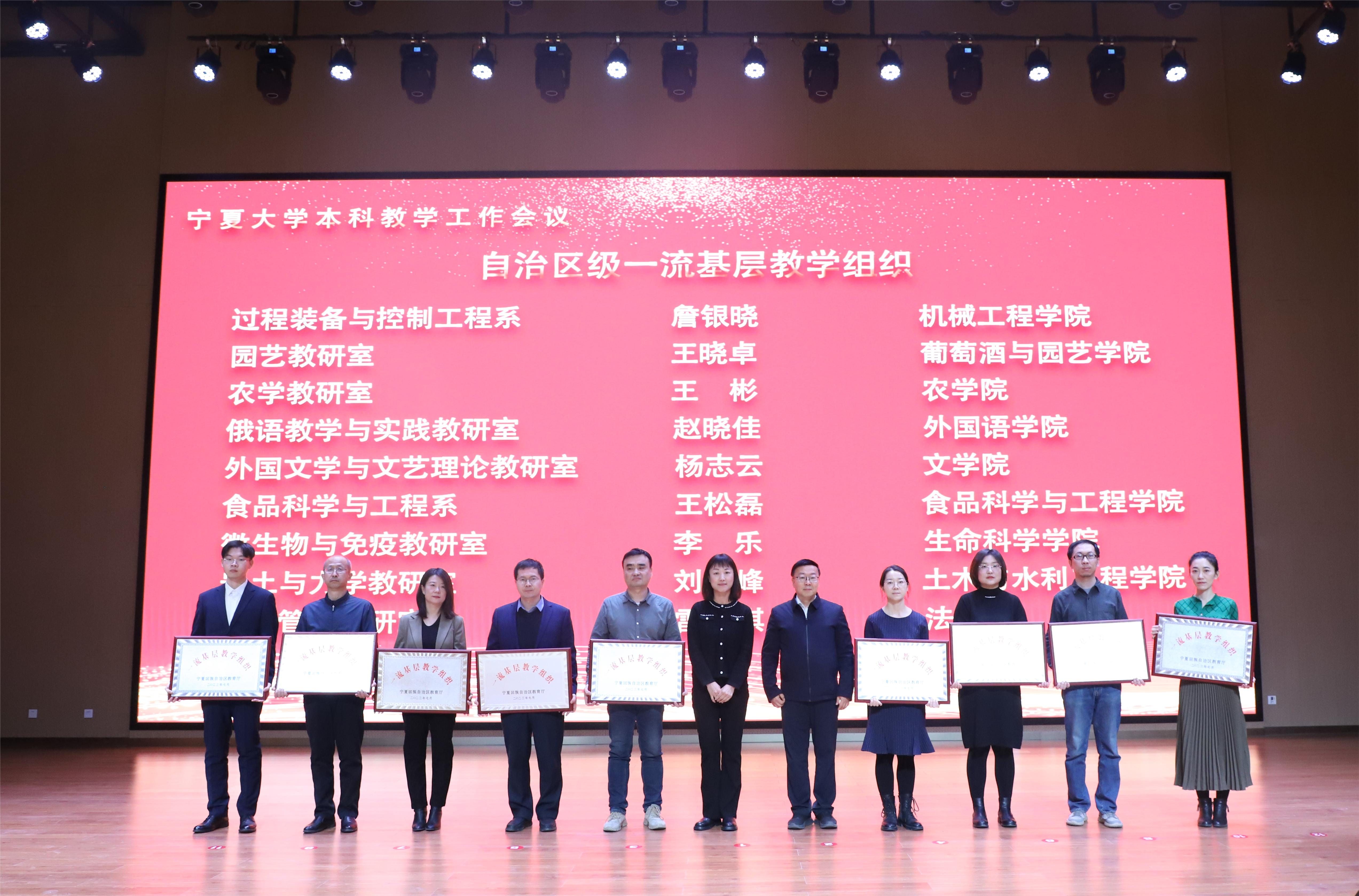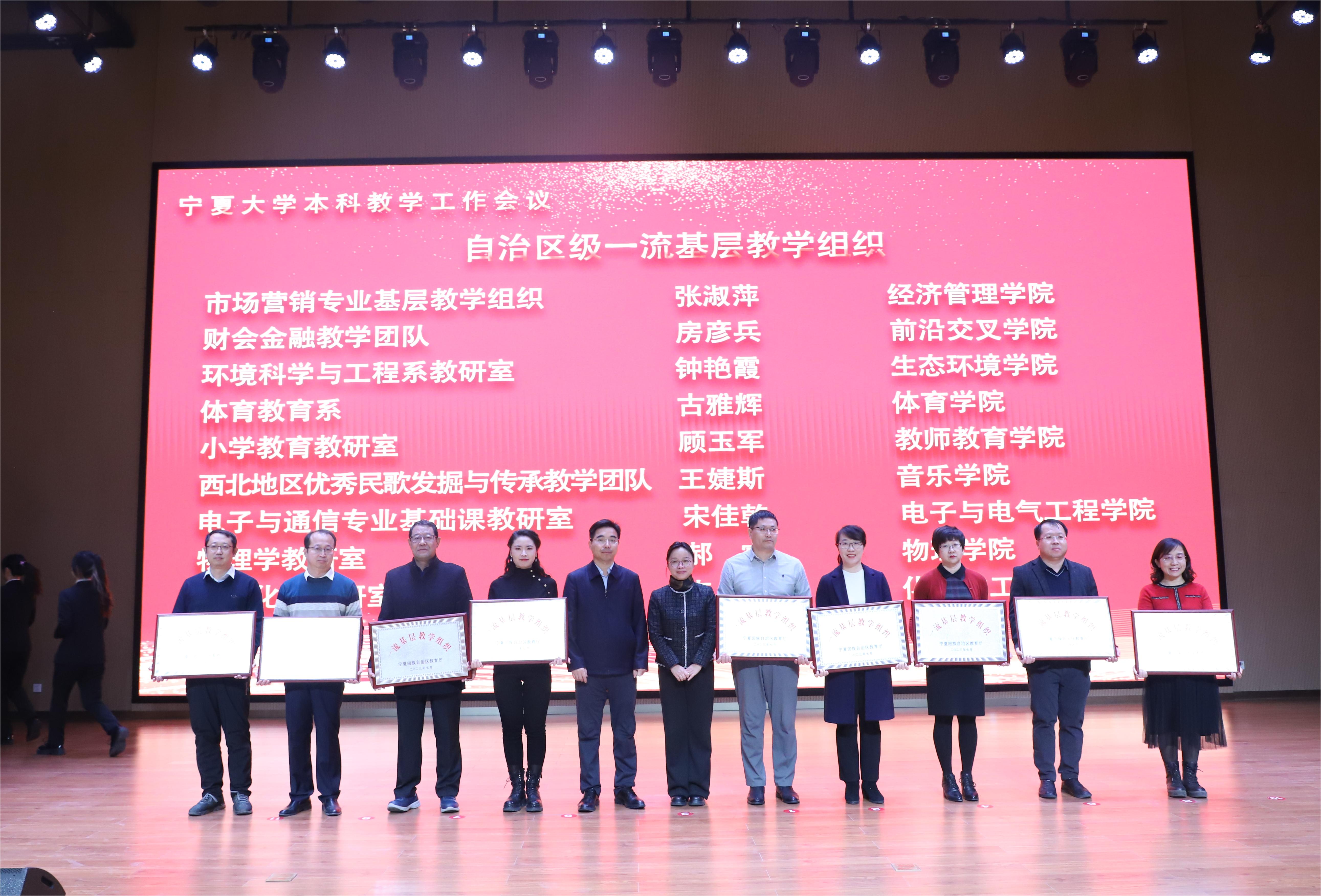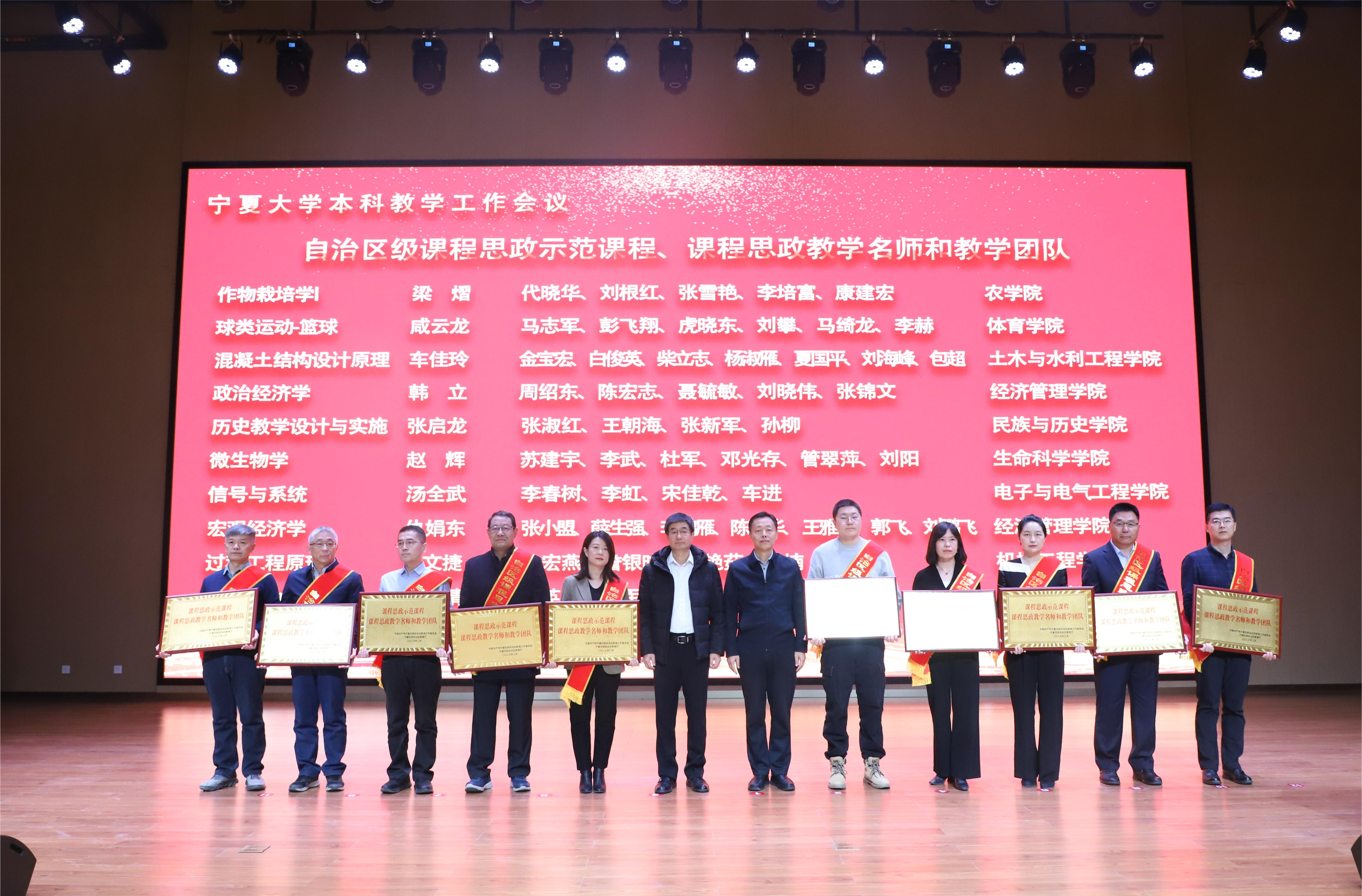 会上,校领导李星、彭志科为获得国家级一流本科课程、国家级课程思政示范课程、课程思政教学名师和教学团队的教师颁奖;校领导周震、刘炎胜为获得自治区课程思政教学名师和教学团队的教师颁奖;校领导李学斌、黄河、聂丹、赵晓佳为获得自治区级一流基层教学组织代表颁奖。