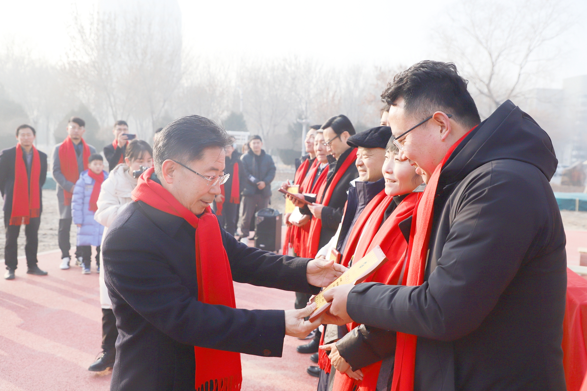 仪式上,李星为校友代表颁发捐赠证书,并与校友代表共同为“沙枣树精神”雕塑揭幕。