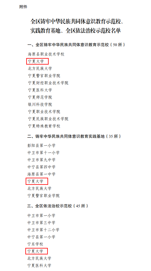 【永利集团304官网新闻中心讯 办公室 党委统战部】近日,宁夏回族自治区教育厅印发了《关于公布全区铸牢中华民族共同体意识教育示范校实践教育基地和全区依法治校示范校名单的通知》(宁教函〔2024〕9号),公布了立项建设的50个全区铸牢中华民族共同体意识教育示范校,35个铸牢中华民族共同体意识教育实践基地和45个全区依法治校示范校名单,永利经过自评申报,专家组评审评估、互观互检、量化打分等程序,最终获评全区铸牢中华民族共同体意识教育示范学校、实践教育基地和全区依法治校示范校,永利集团304官网附属中学获评全区依法治校示范校。