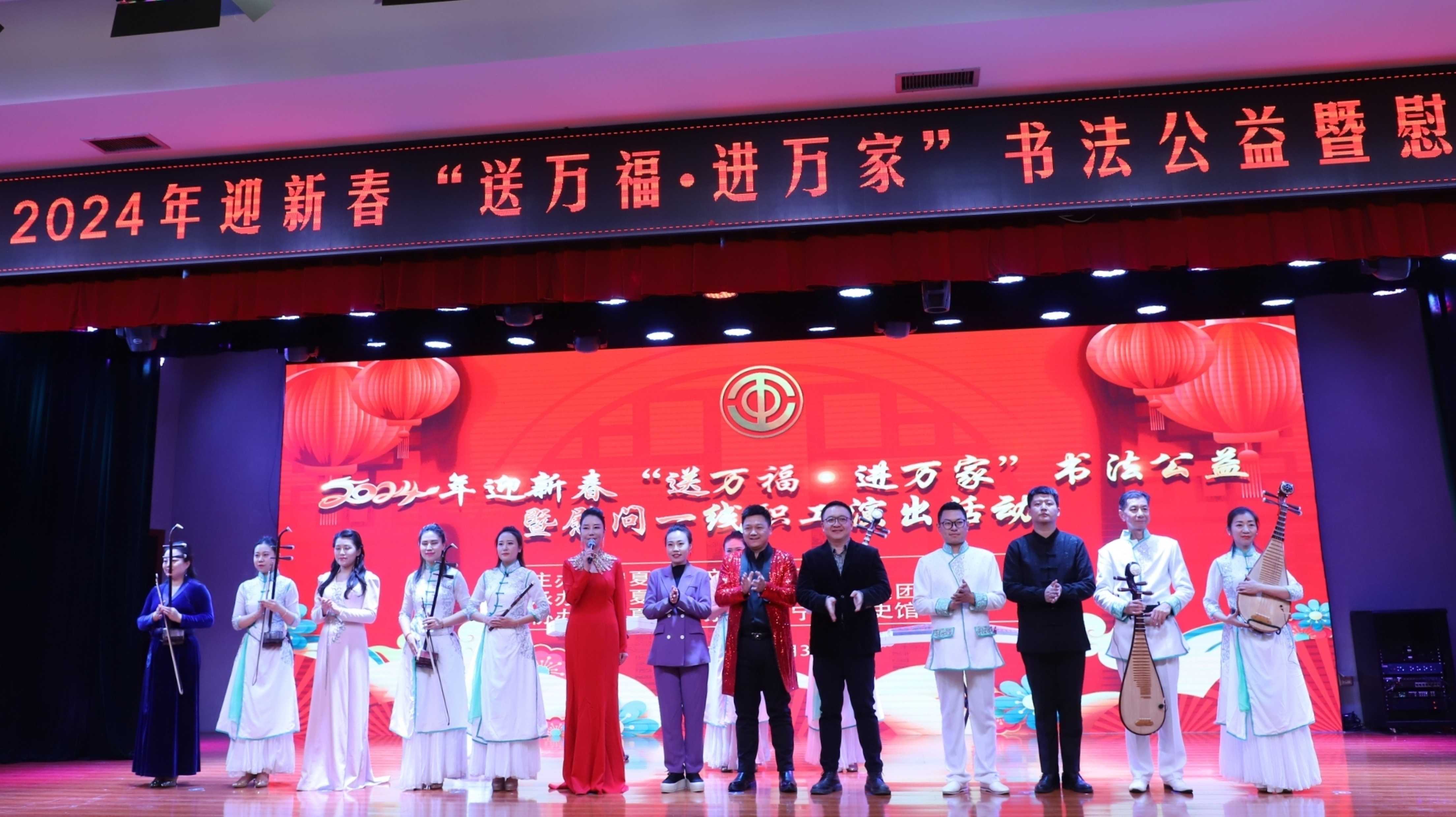 【永利集团304官网新闻中心讯 工会 杨雯/文 杨雯 王文娣/图】在辞旧迎新之际,为大力弘扬劳模精神、劳动精神和工匠精神,表达对广大一线职工和劳动者,特别是春节期间仍在坚守工作岗位的各位职工的关怀和慰问,1月30日,宁夏教科文卫体工会在永利学术交流中心隆重举办2024年迎新春“送万福 进万家”书法公益暨慰问一线职工演出活动。宁夏教科文卫体工会主席赵连瑞,宁夏文史研究馆副馆长、宁夏书法家协会主席宋琰,宁夏工商职业学院党委书记、宁夏书法家协会副主席陈晓军出席活动,宁夏教科文卫体工会兼职副主席、校工会主席孙建军主持活动。