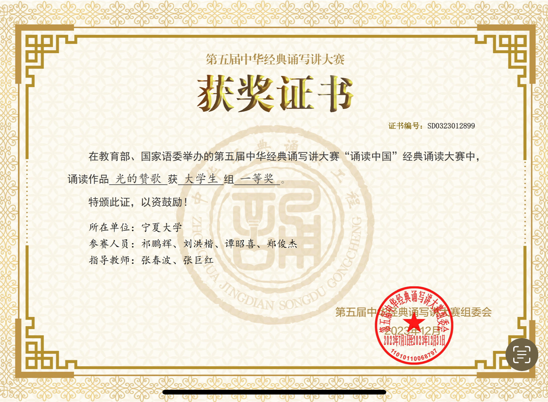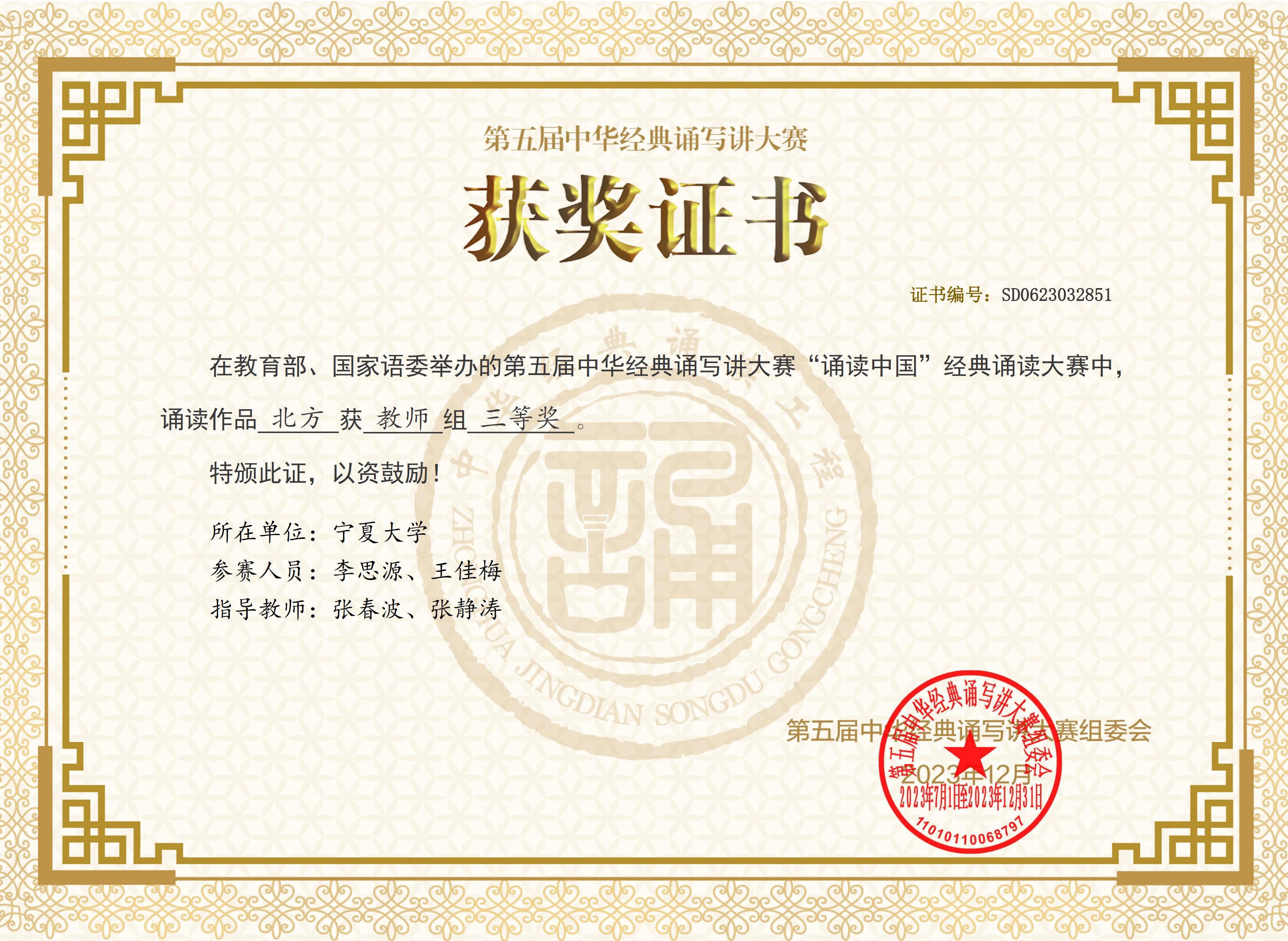 【永利集团304官网新闻中心讯 本科生院】近日,教育部、国家语委公布了第五届中华经典诵写讲大赛获奖名单。永利集团304官网获得优秀组织奖,永利推荐的作品《光的赞歌》获大学生组一等奖、《我爱你,中国》获留学生组一等奖、《北方》获教师组三等奖、《兰亭集序》《我爱这土地》分别获得教师组和留学生组优秀奖,这是永利在此项国家级赛事中取得的历史最好成绩,实现一等奖“零”突破。
