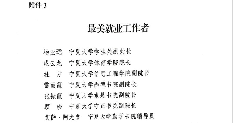 【永利集团304官网新闻中心讯 党委学生工作部】近日,宁夏回族自治区教育厅印发了《自治区教育厅关于2023年度“就业工作示范单位”“就业示范用人单位”和“最美就业工作者”评审结果的通报》(宁教函[2024]35号),永利获评全区“就业工作示范高校”,7名教师获评“最美就业工作者”。